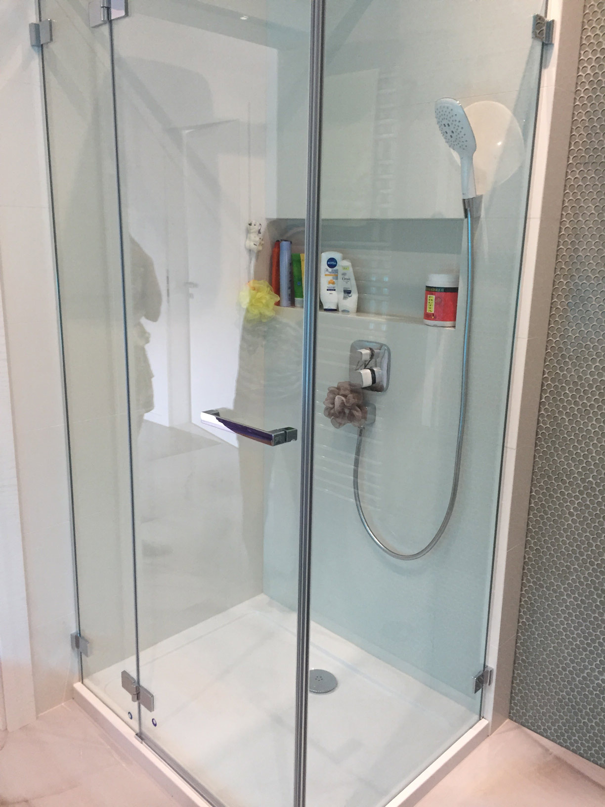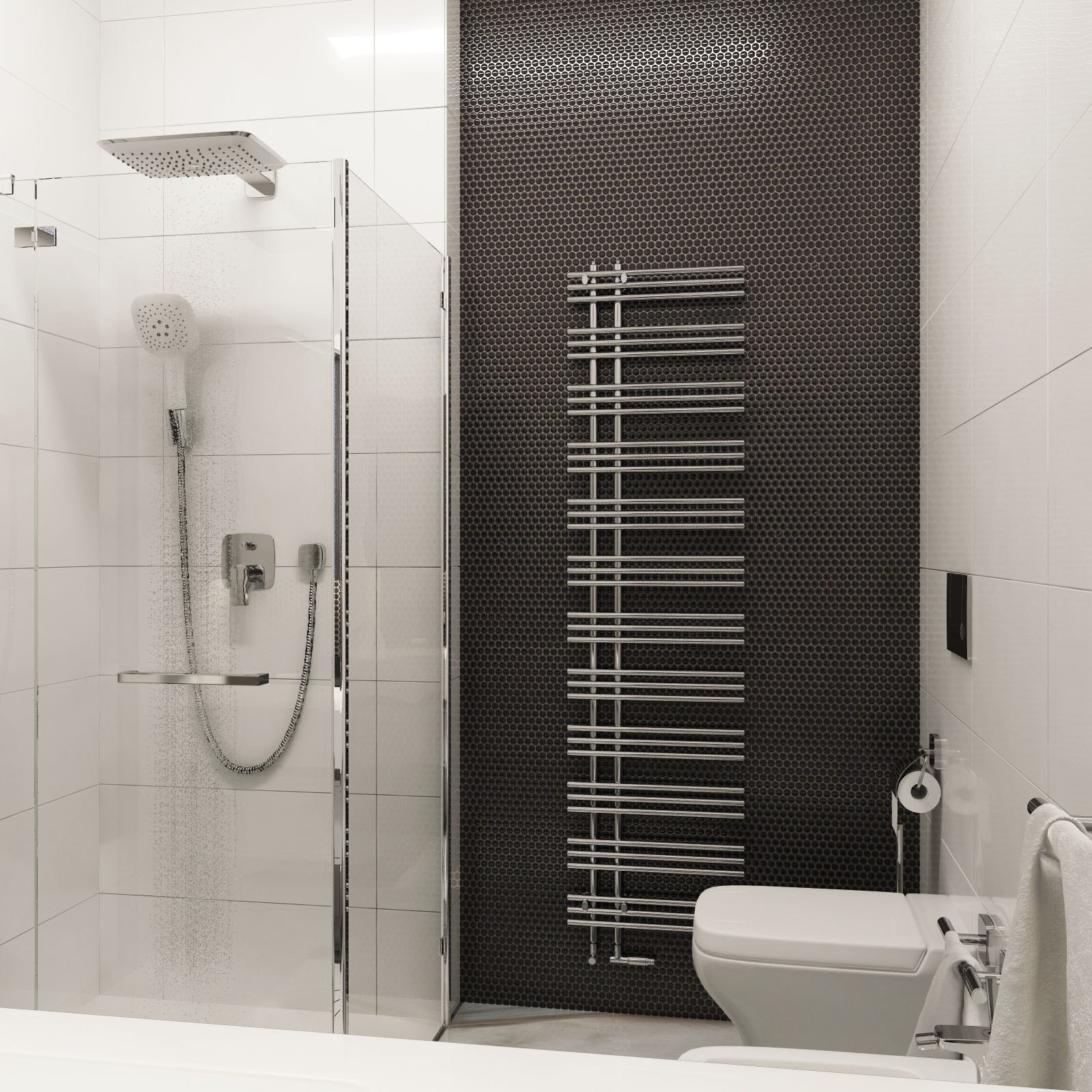 White tile combining with mosaic on a wall and large tile on a floor (by Rex ceramic)