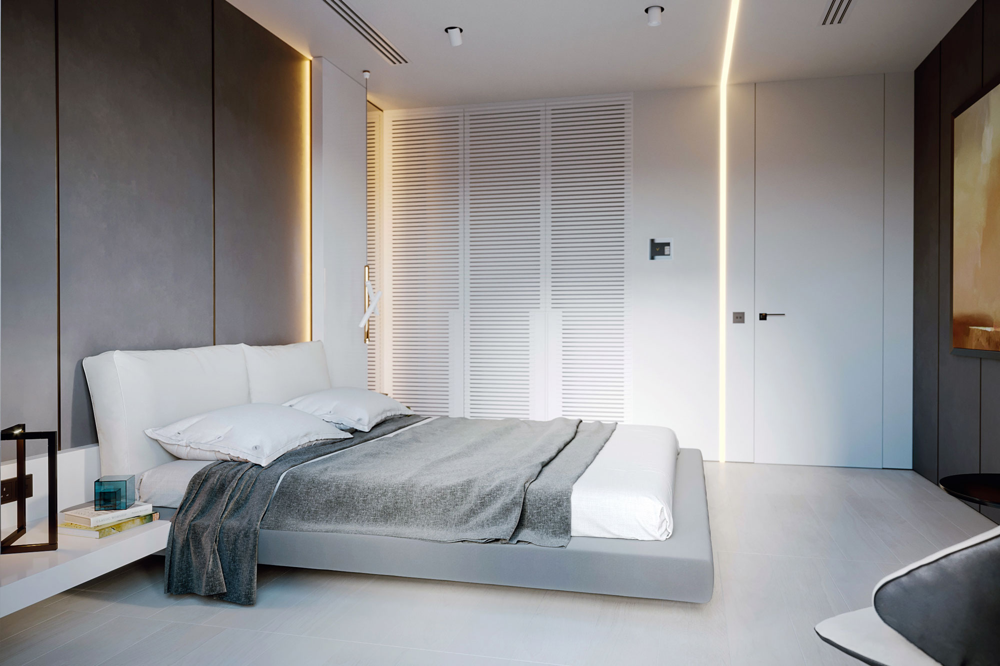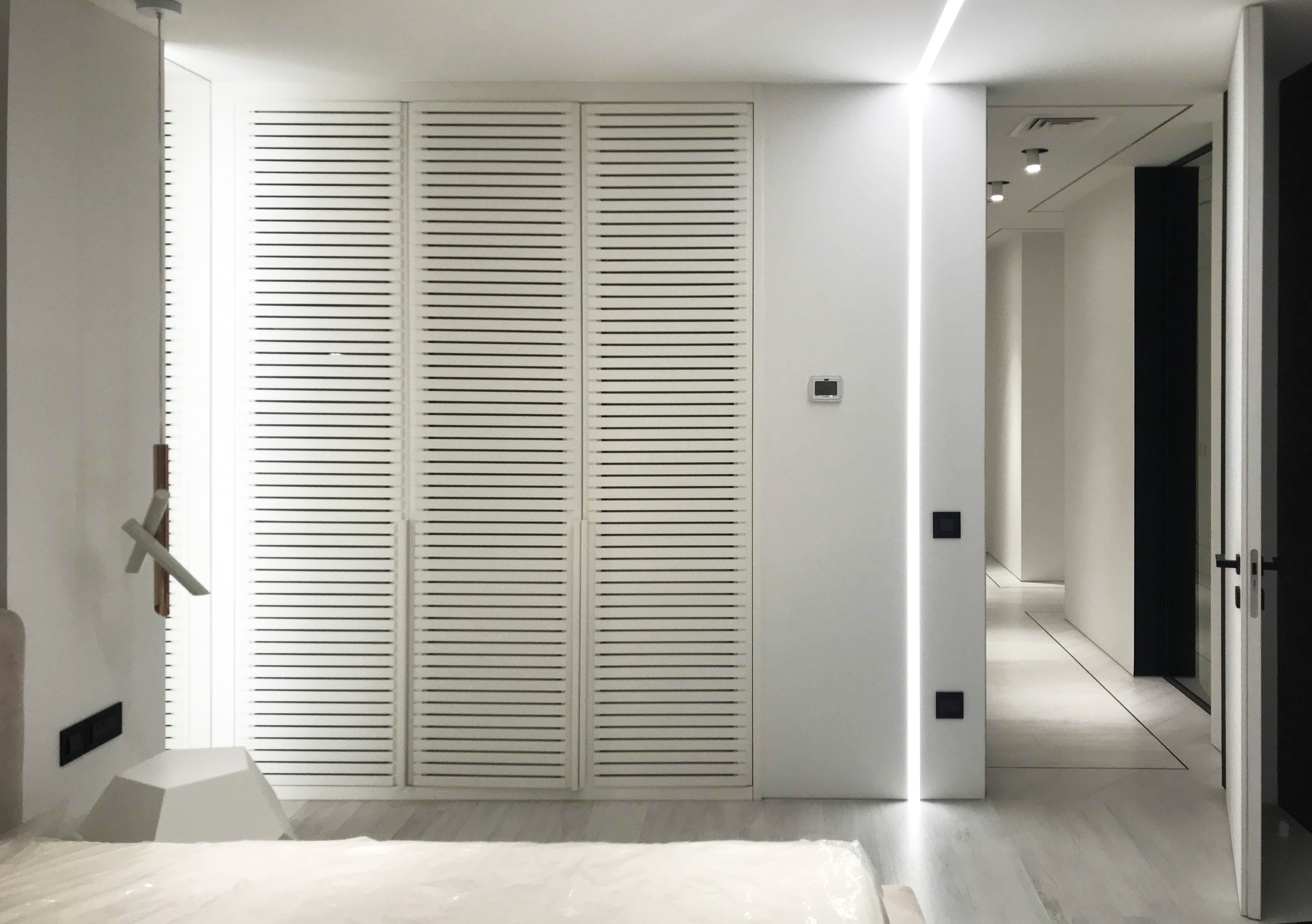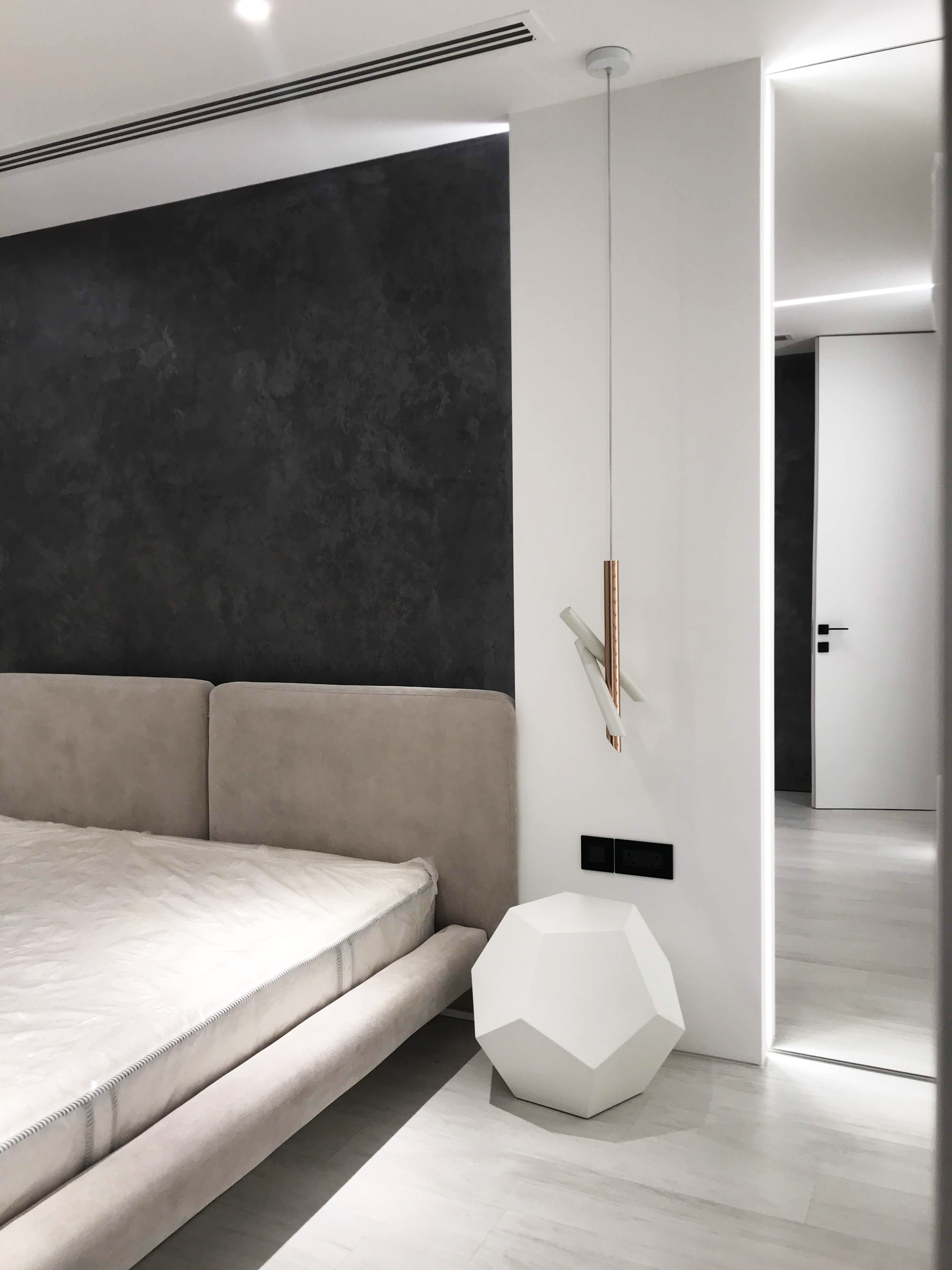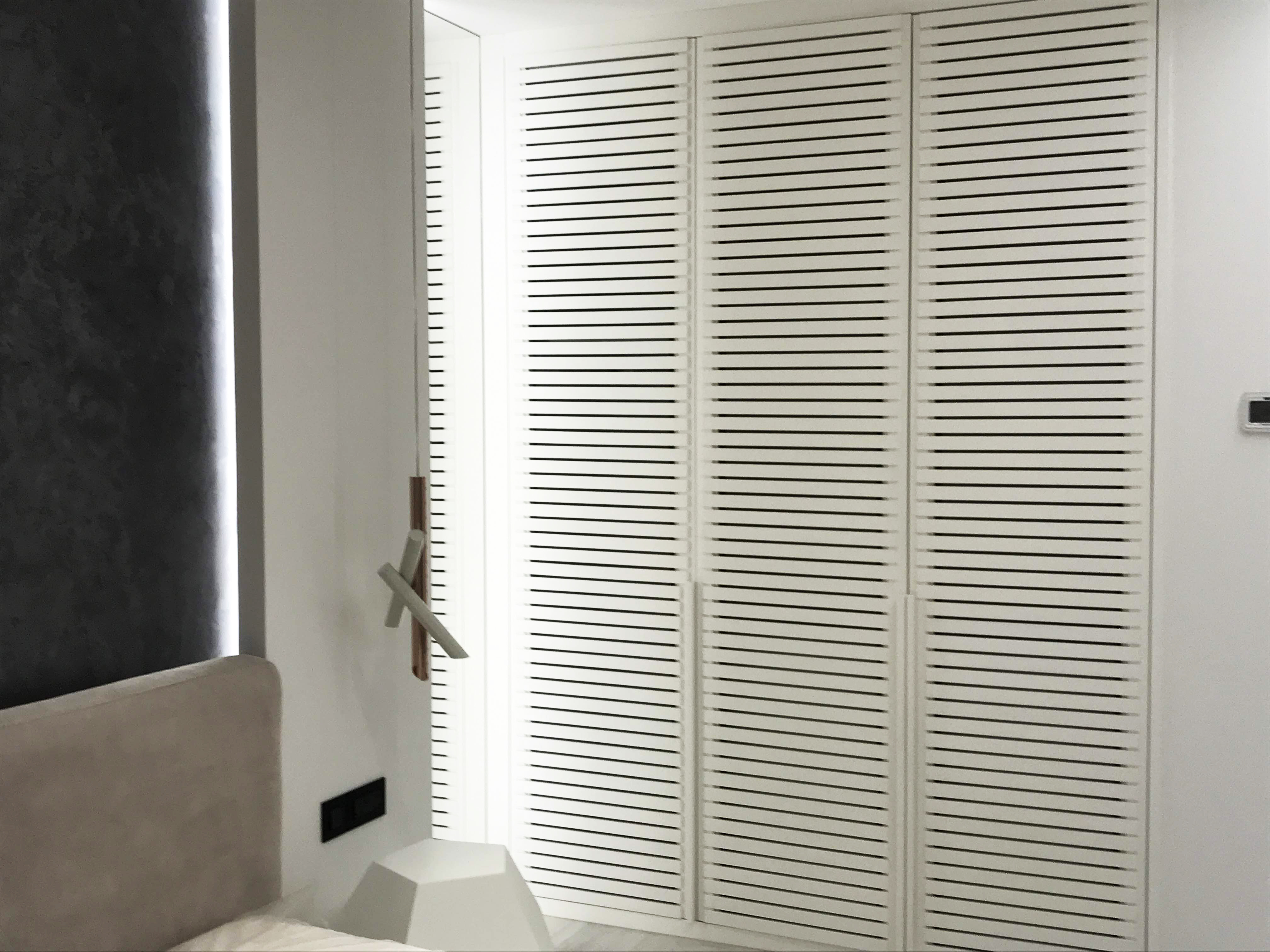 Bedroom for a family member. The main place was taken by king size bed, in a corner located armchair with little computer table. Walls are decorated with a plaster tortora color, wardrobe doors with shutters.