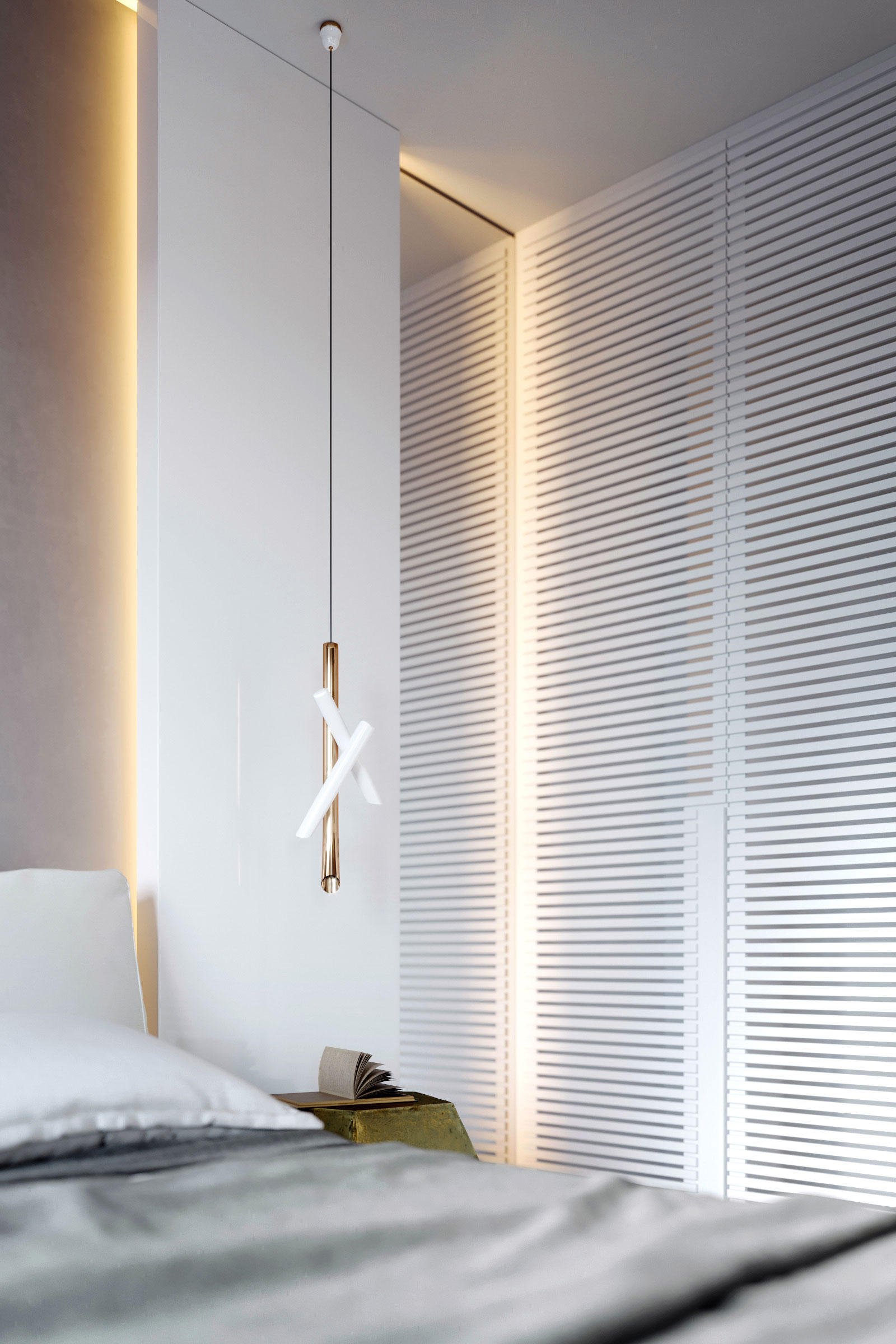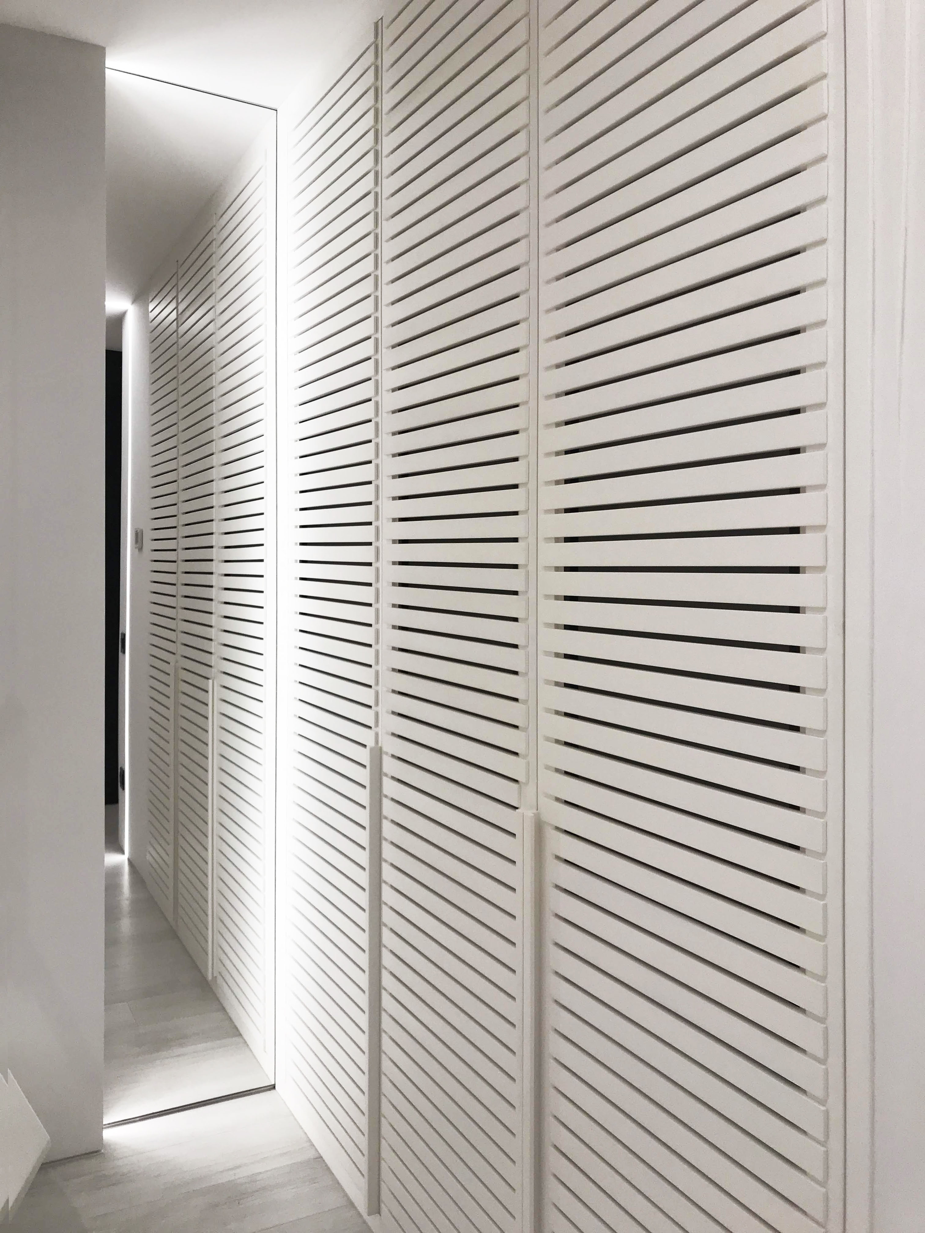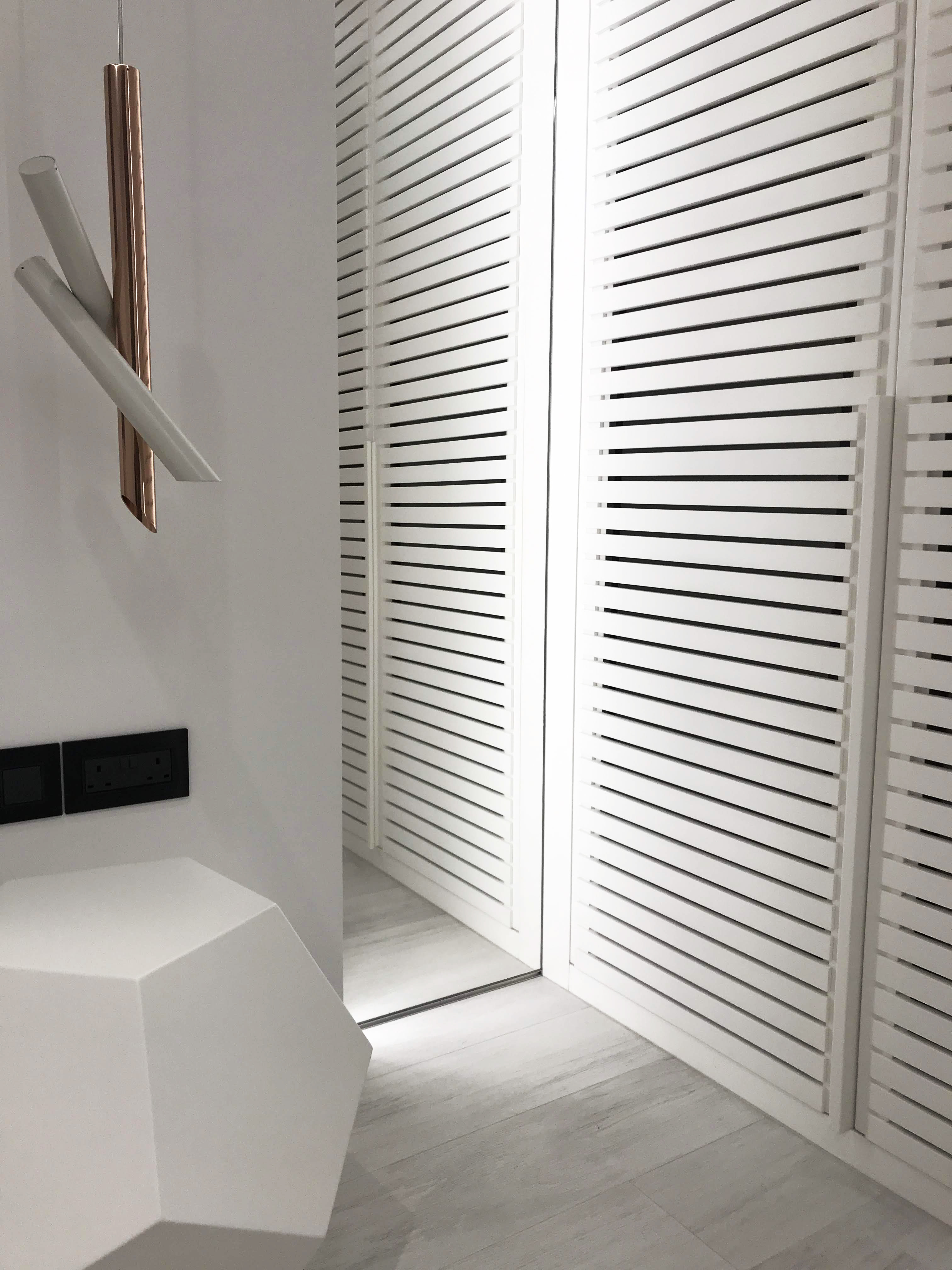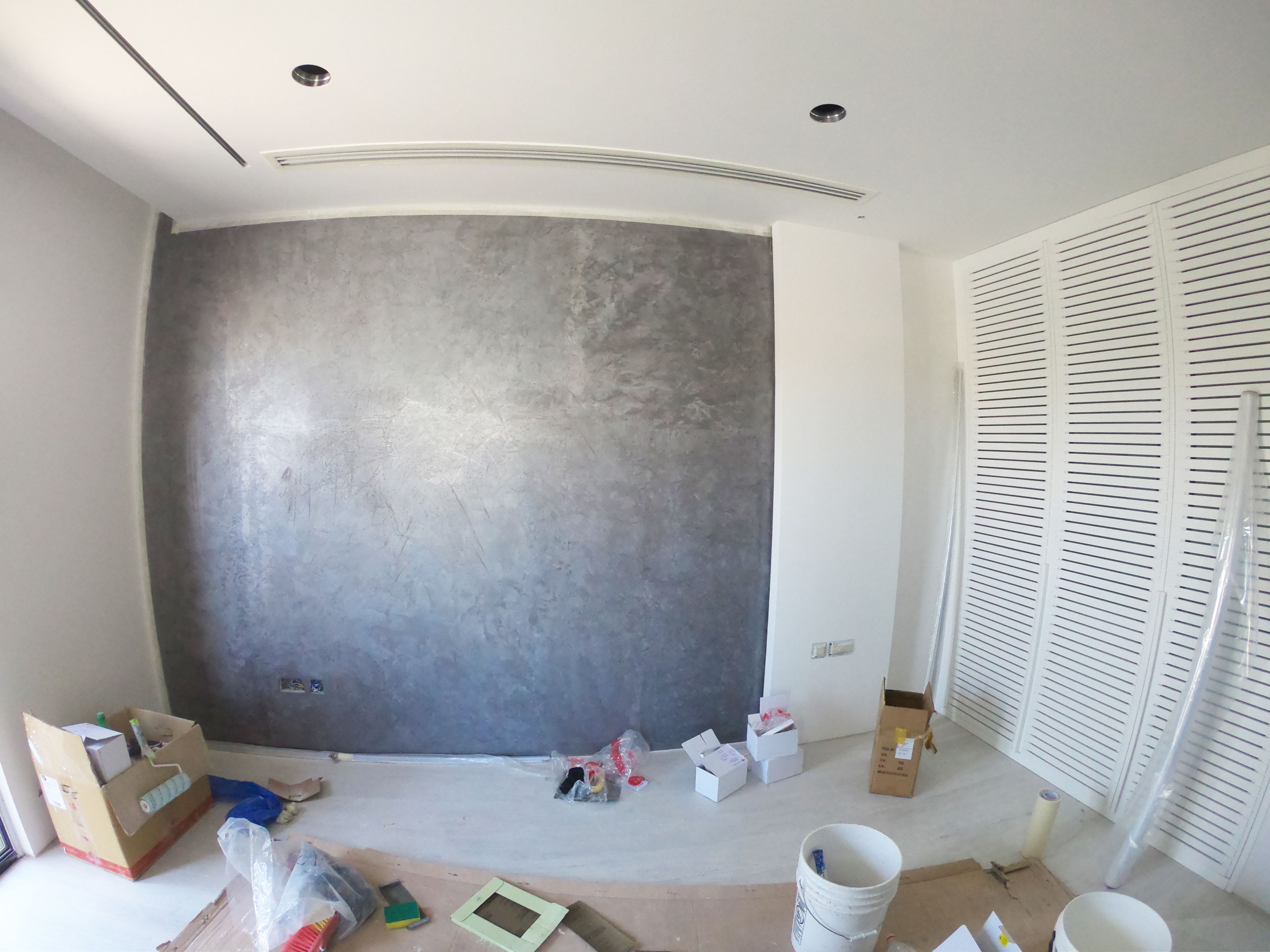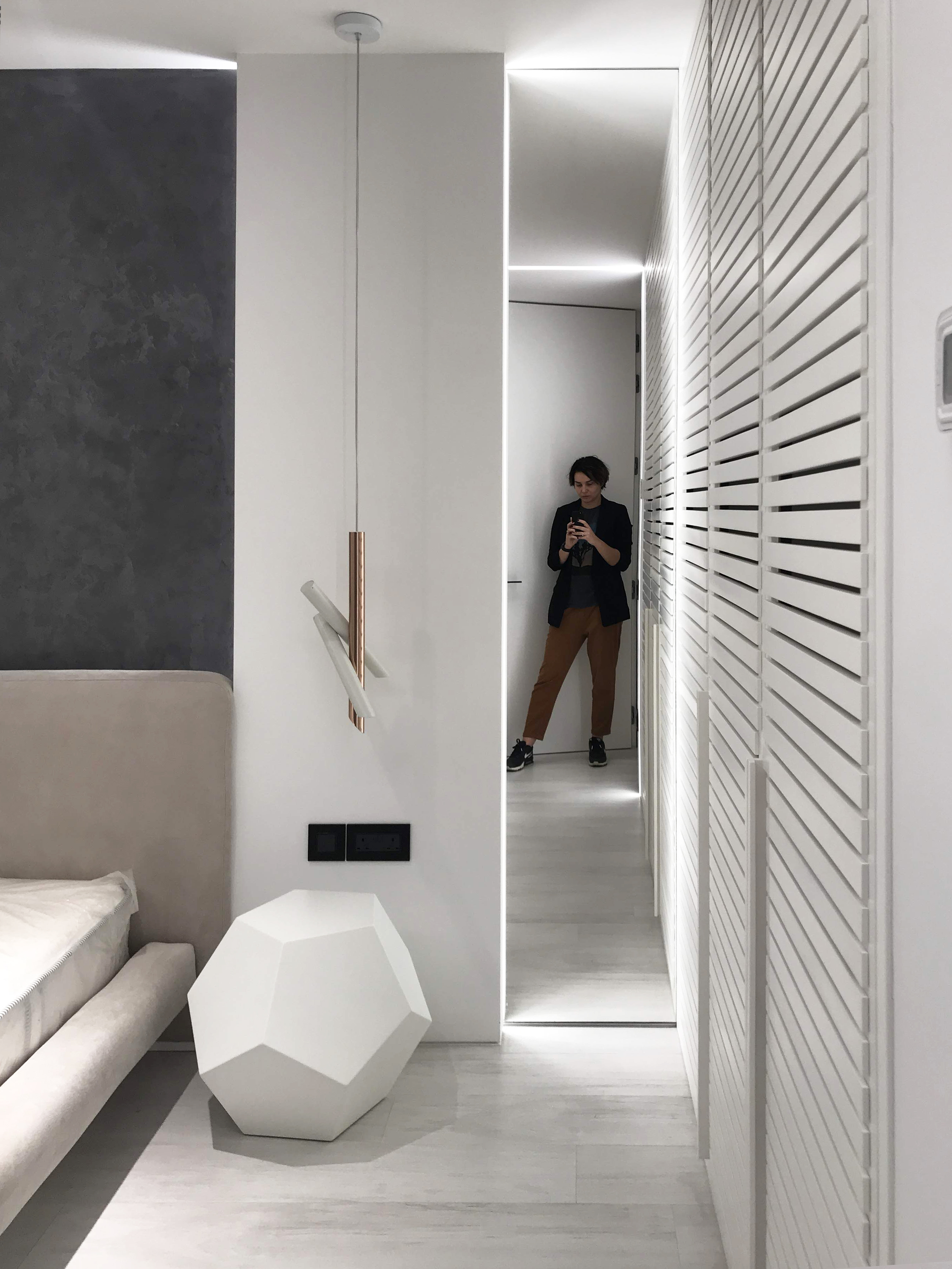 Bedroom for a family member. The main place was taken by king size bed, in a corner located armchair with little computer table. Walls are decorated with a plaster tortora color, wardrobe doors with shutters.