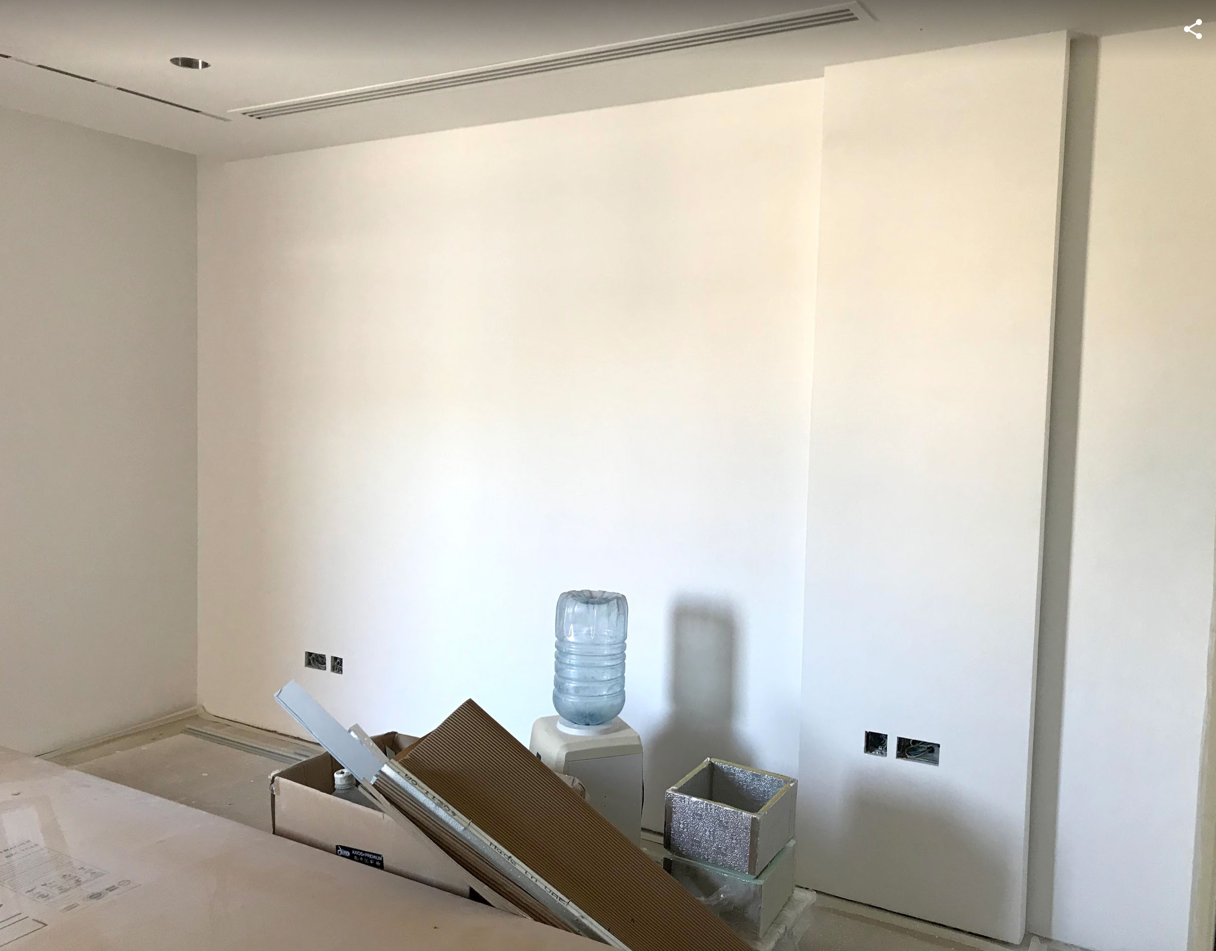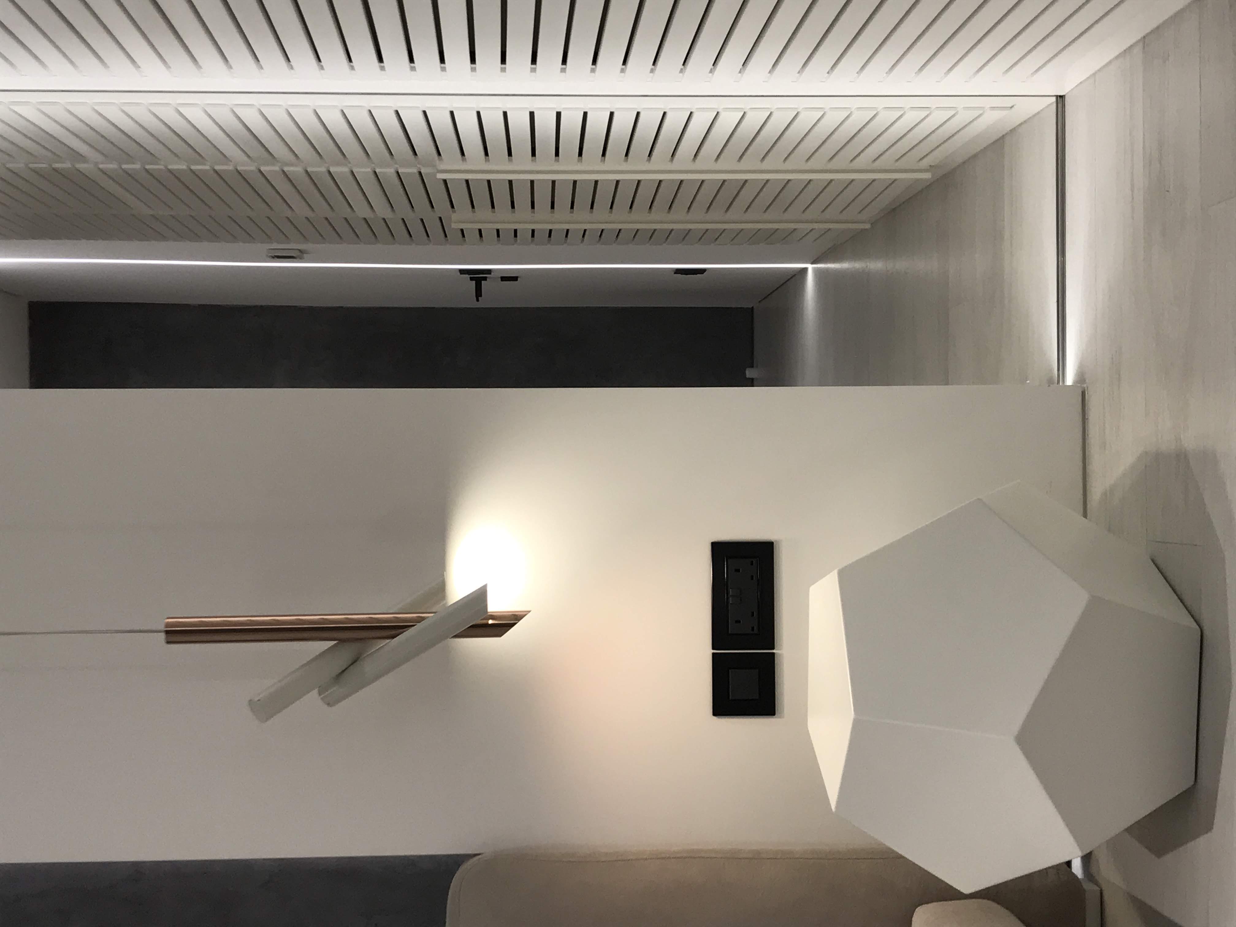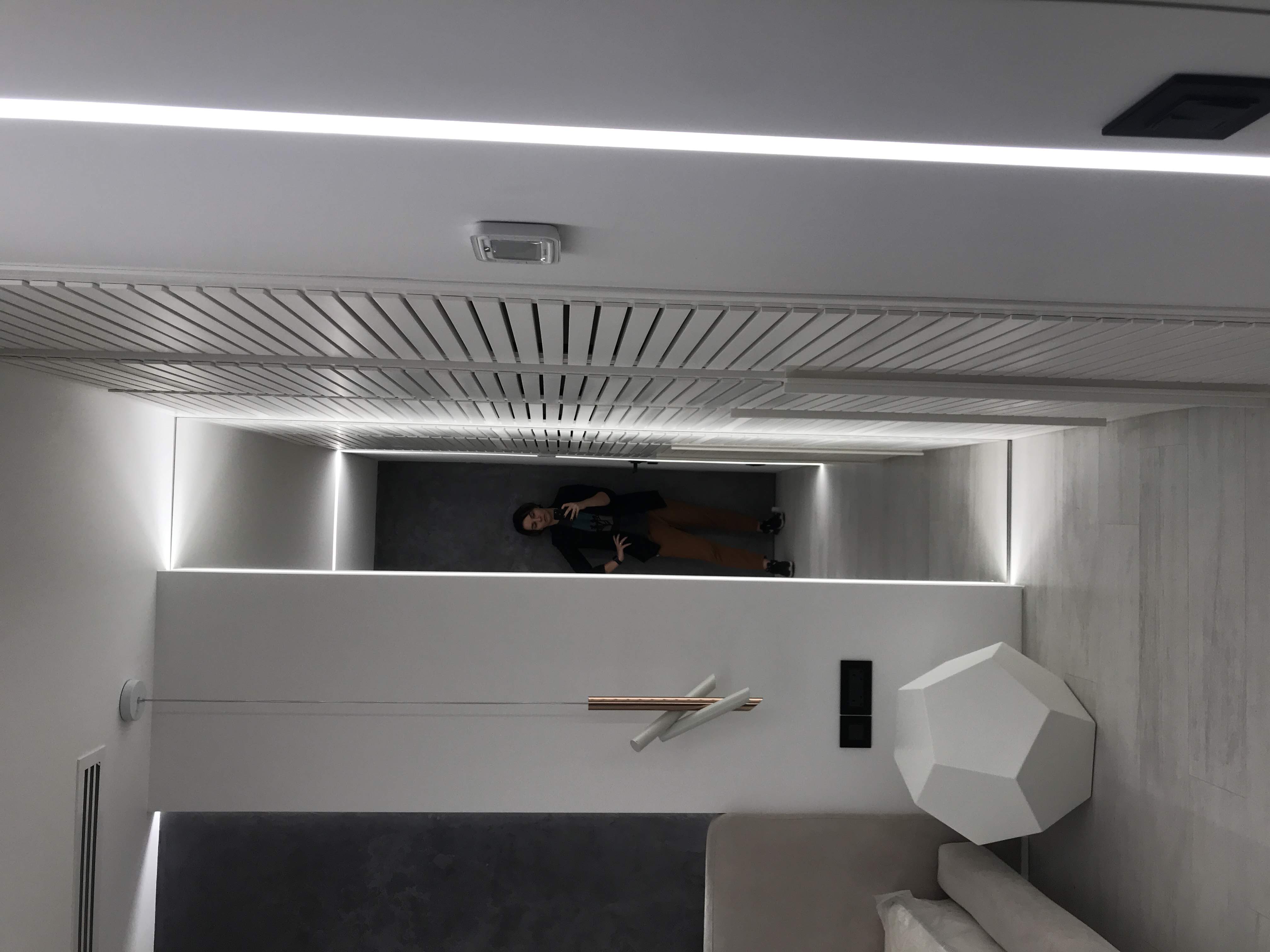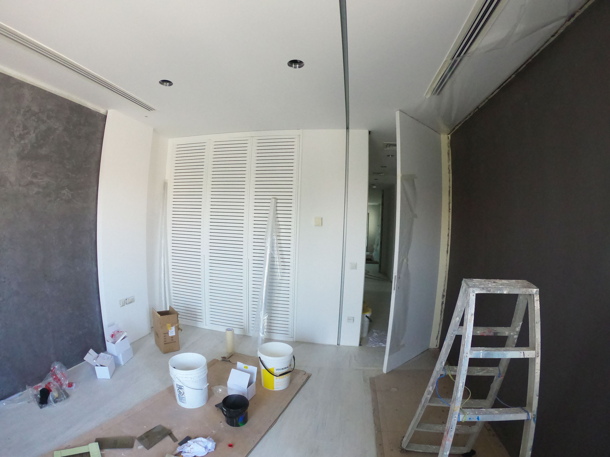 Bedroom for a family member. The main place was taken by king size bed, in a corner located armchair with little computer table. Walls are decorated with a plaster tortora color, wardrobe doors with shutters.