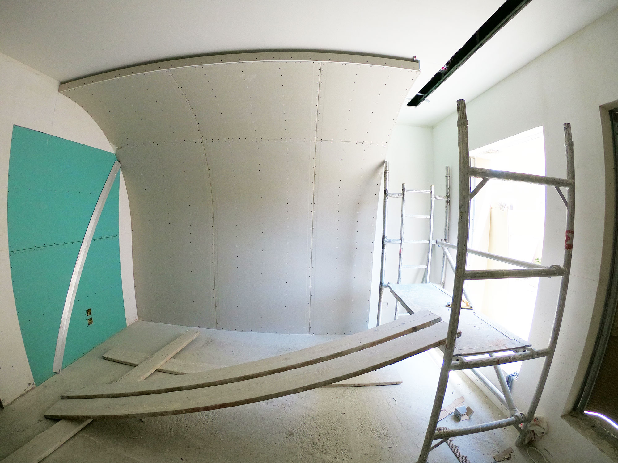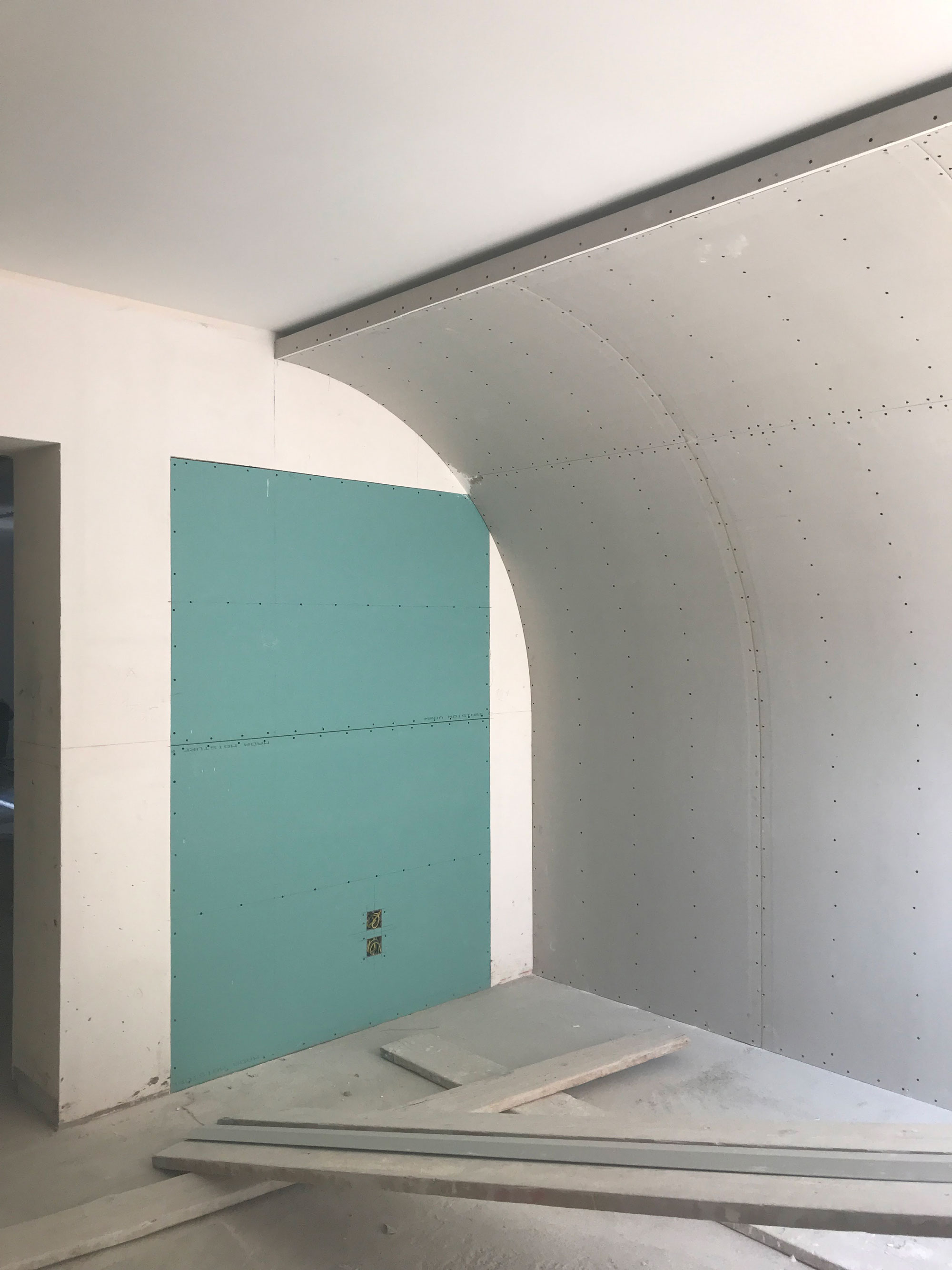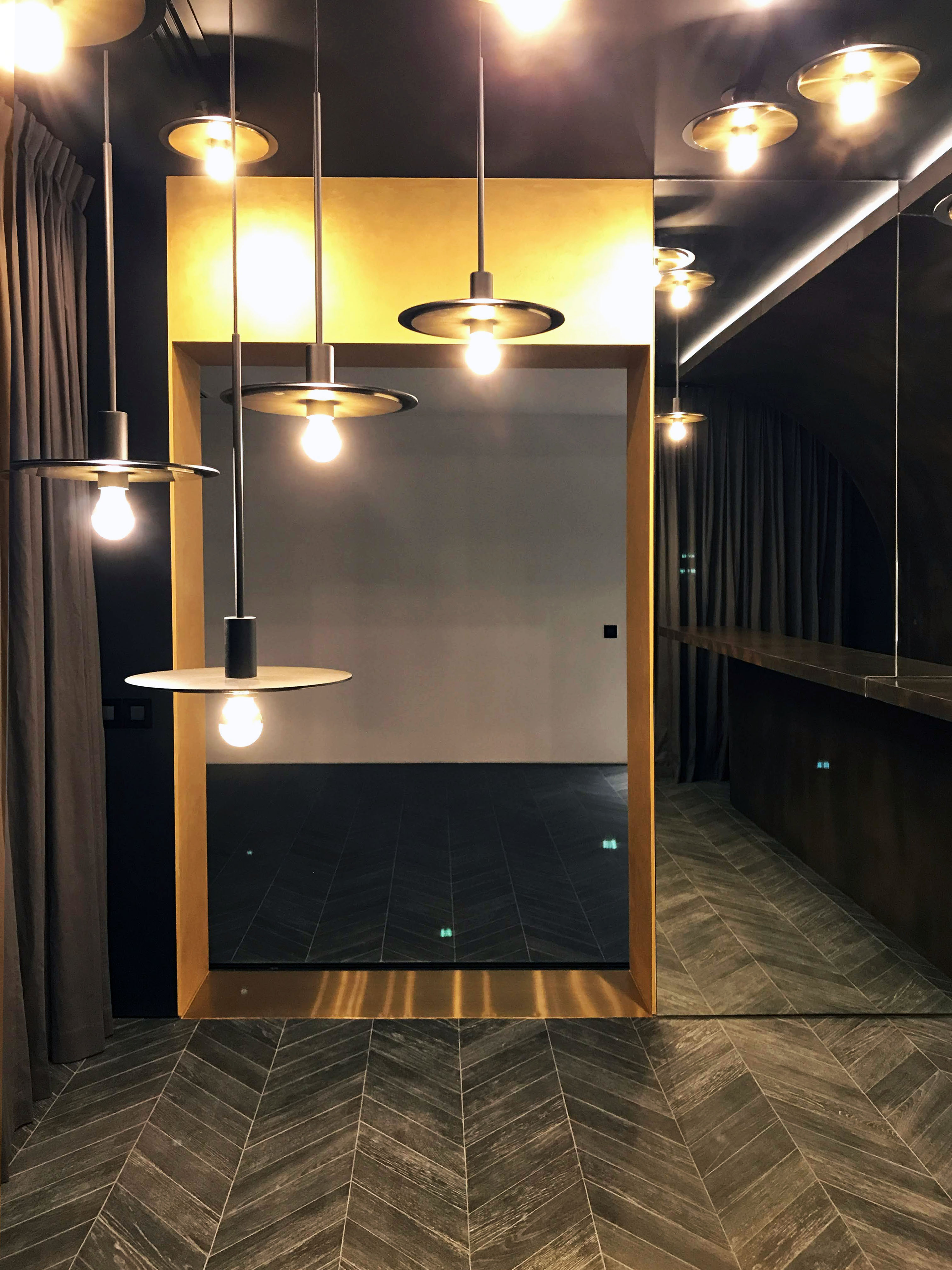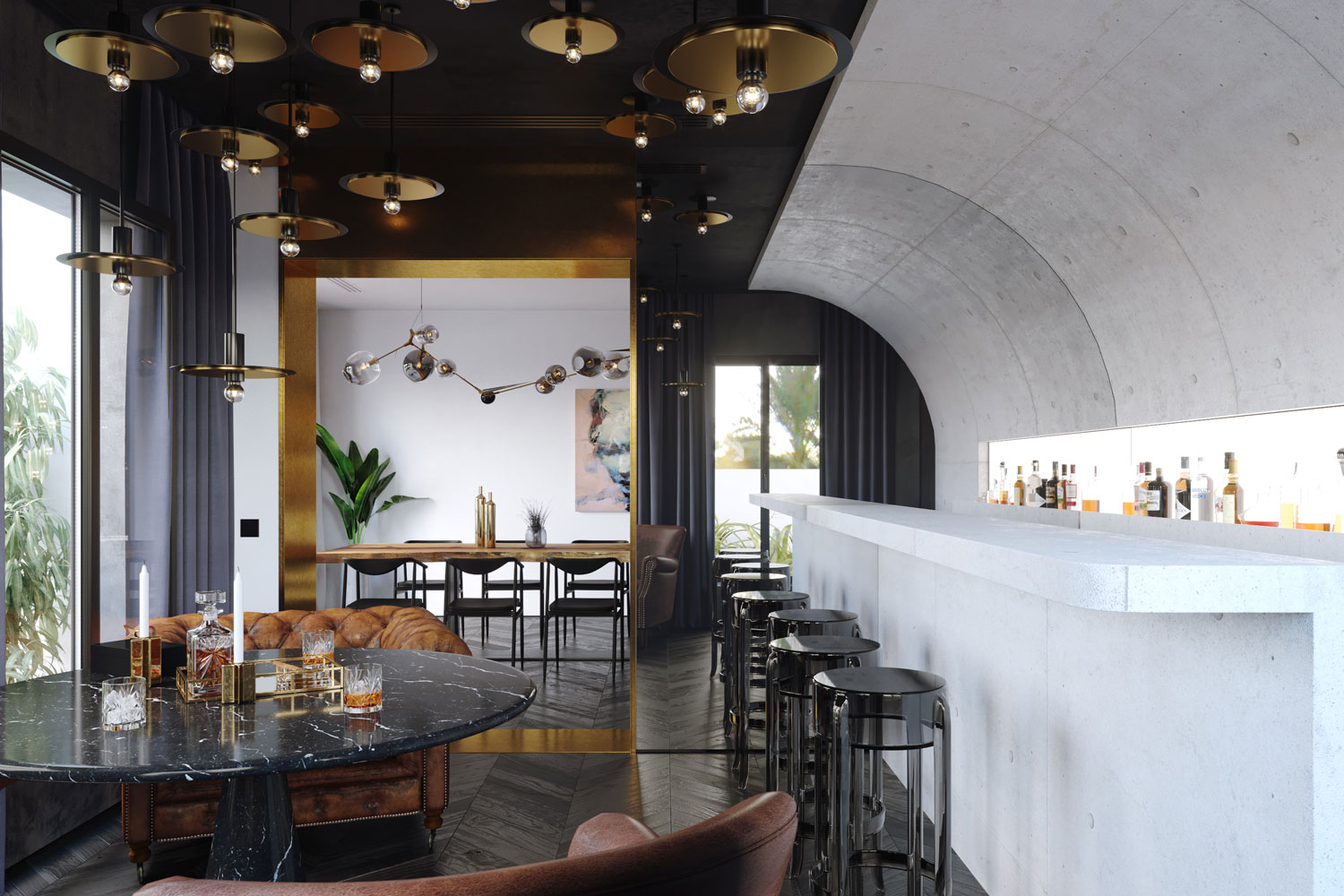Personal Bar. Behind the sliding door, entrance to the home bar decorated with bronze. Concrete bar corner connected with a mirror wall, which visually doubled its size. Ceiling and wall covered in dark plaster. In the center is furniture combination with leather armchairs and marble table.