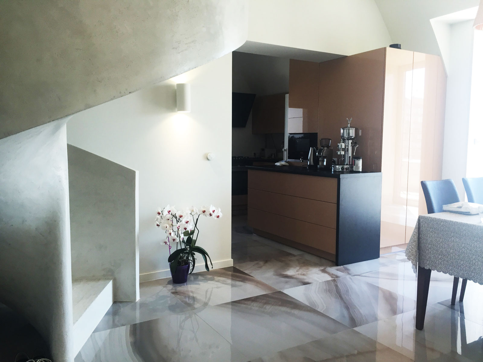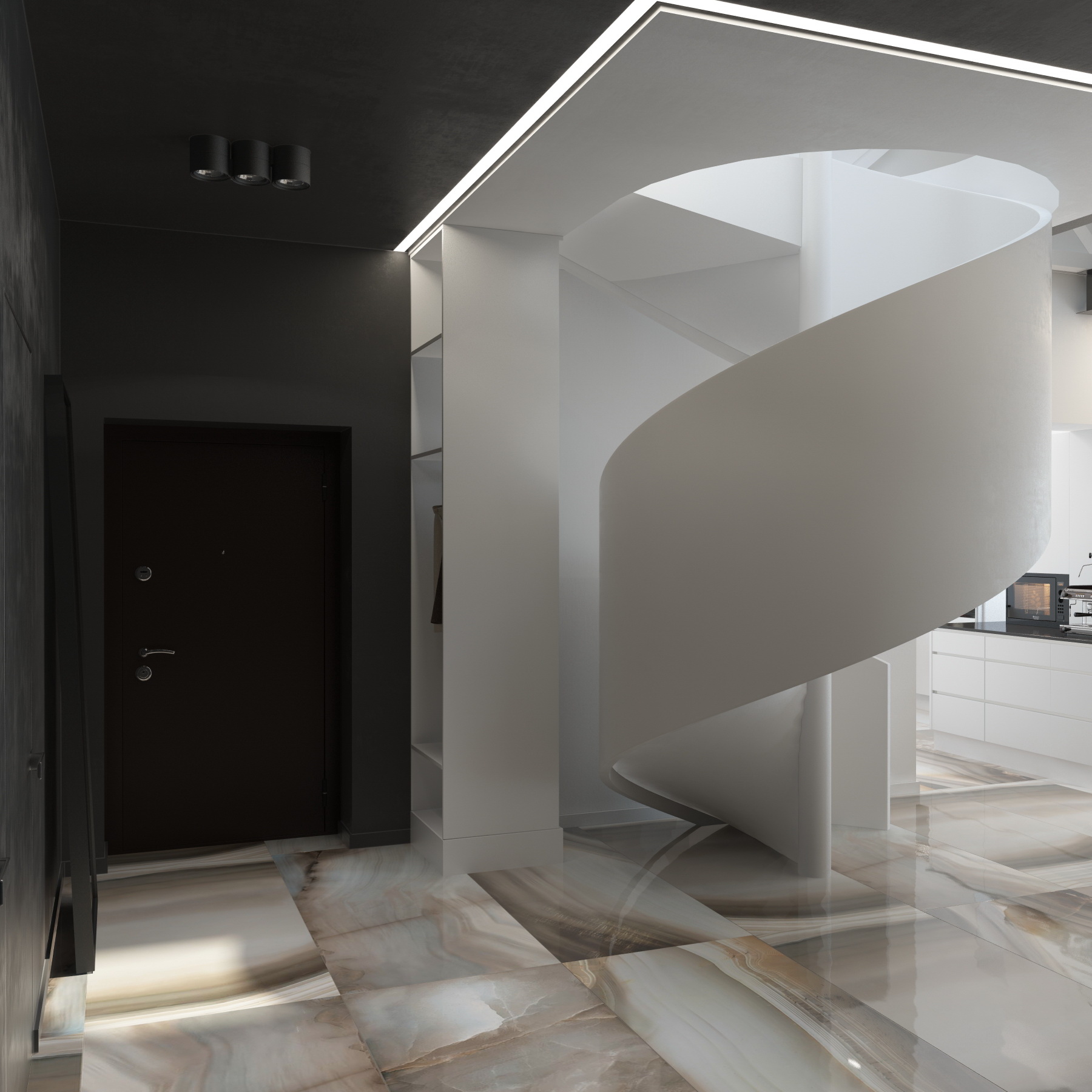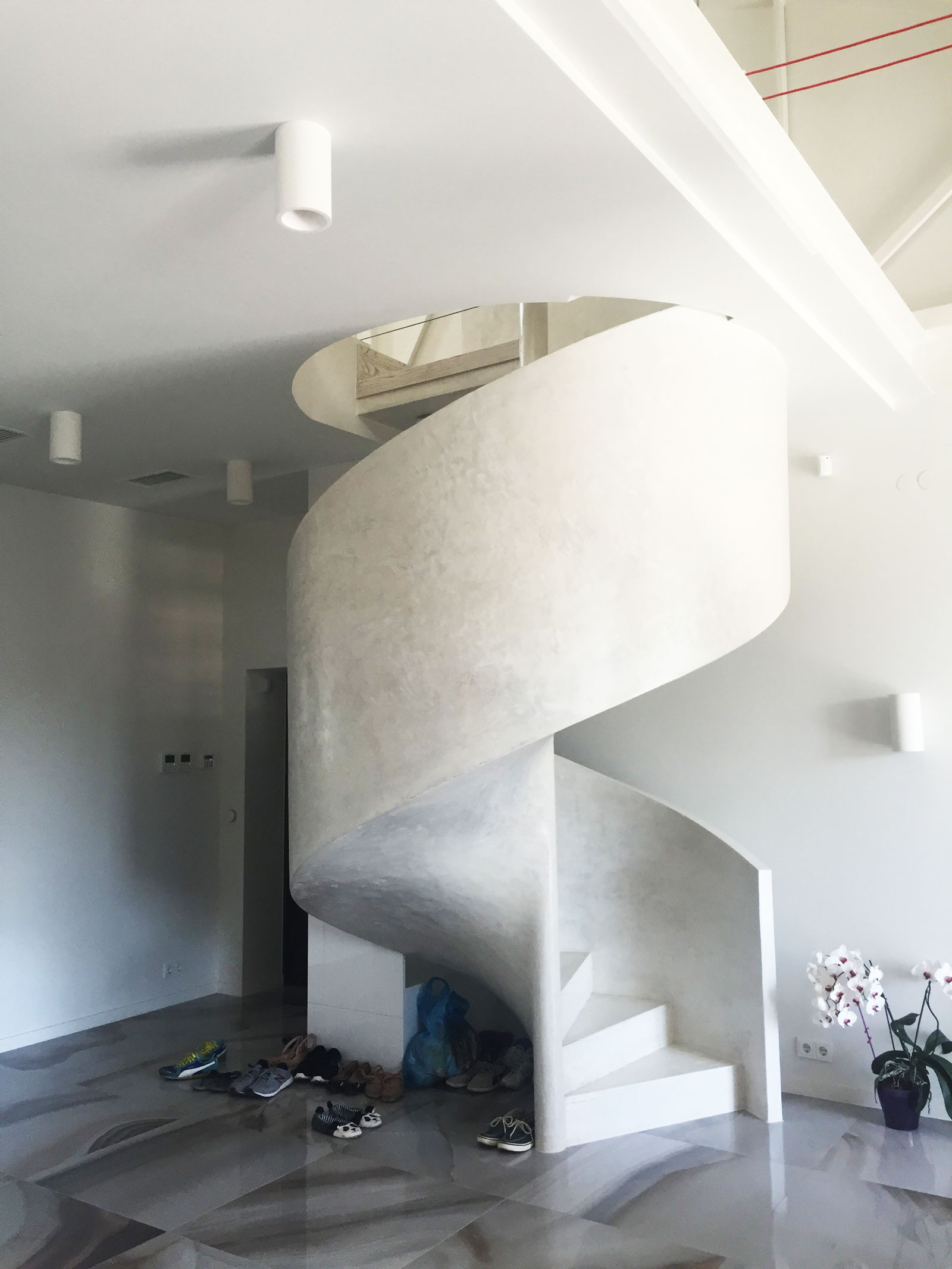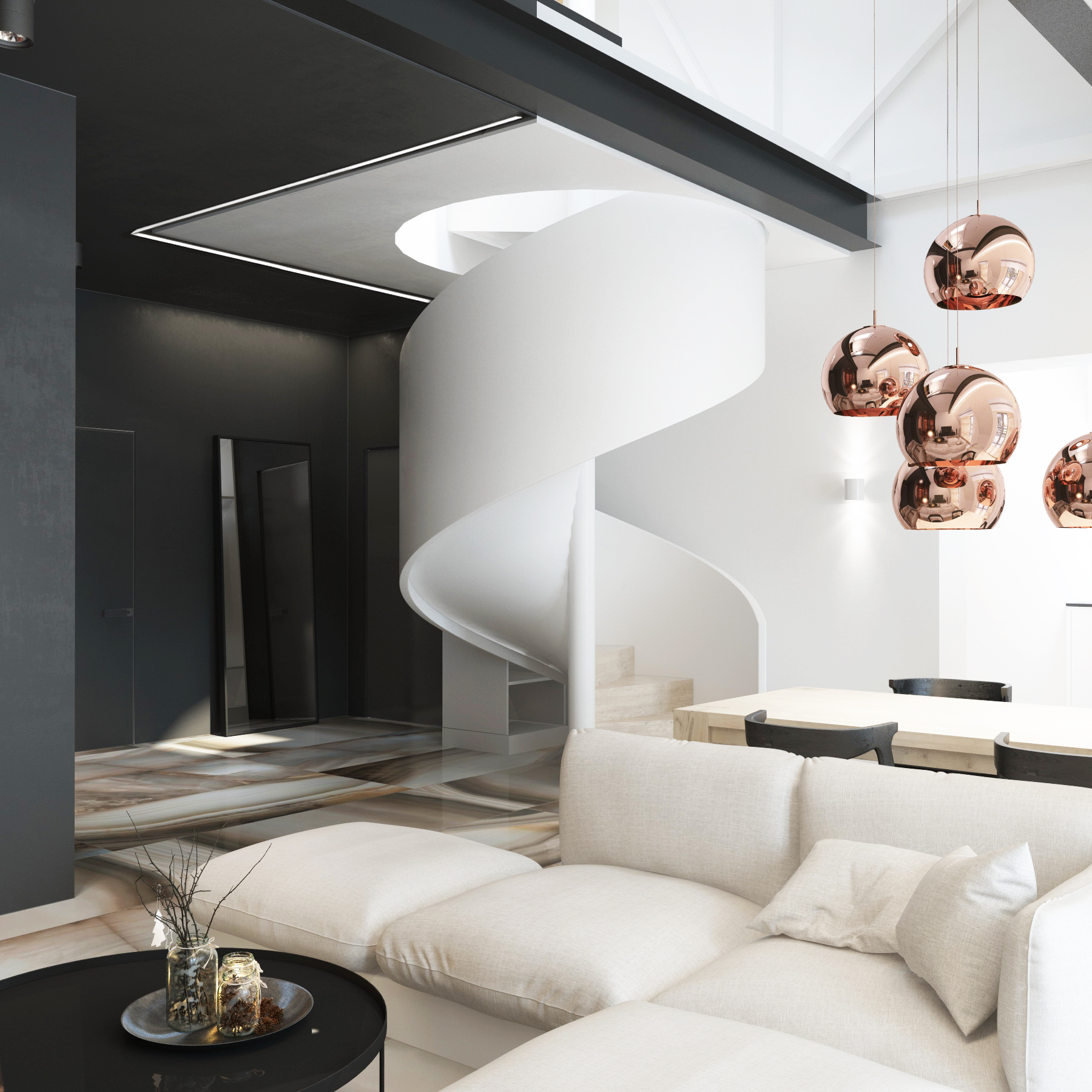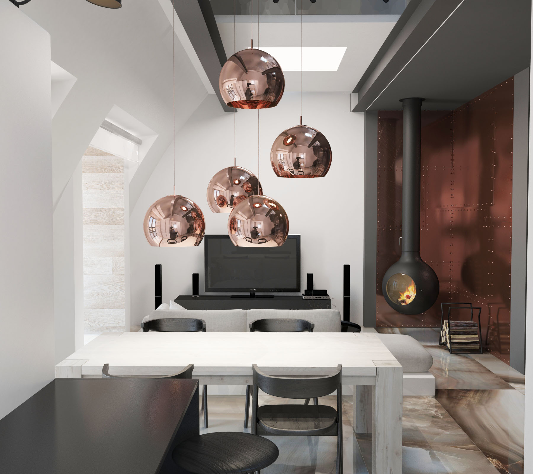First option of the penthouse design project. Living room with full concrete stairs, fireplace and copper wall.