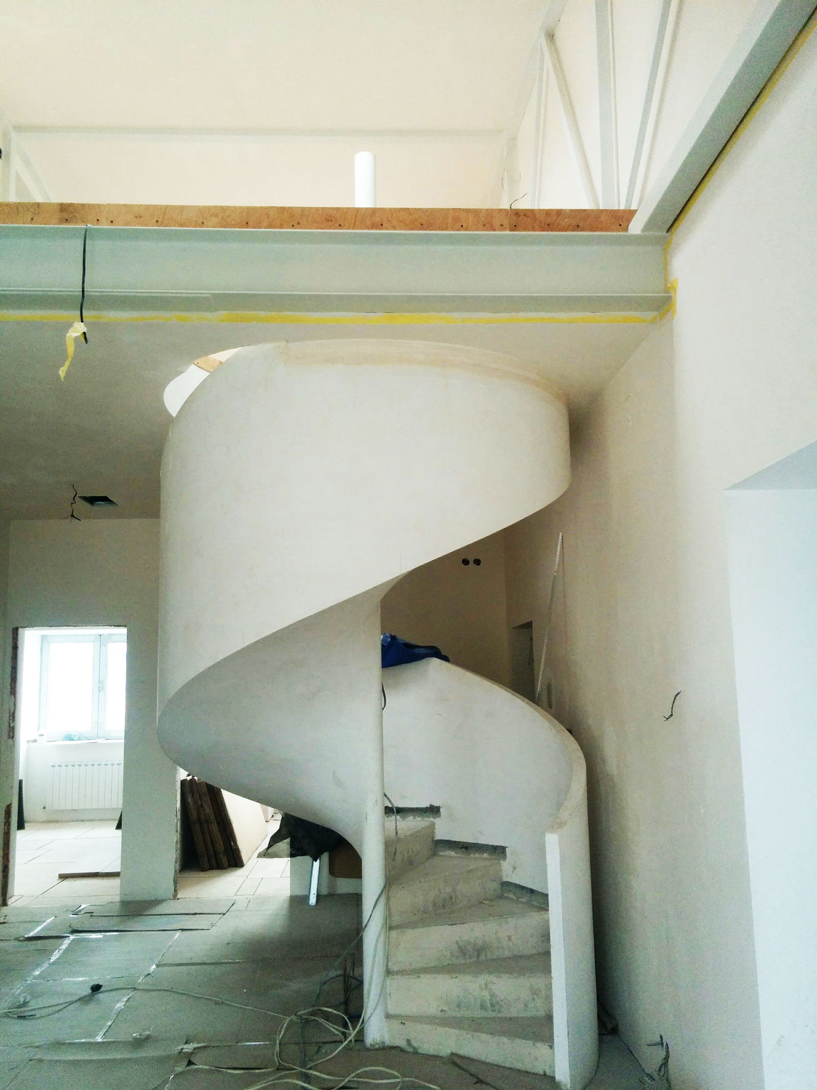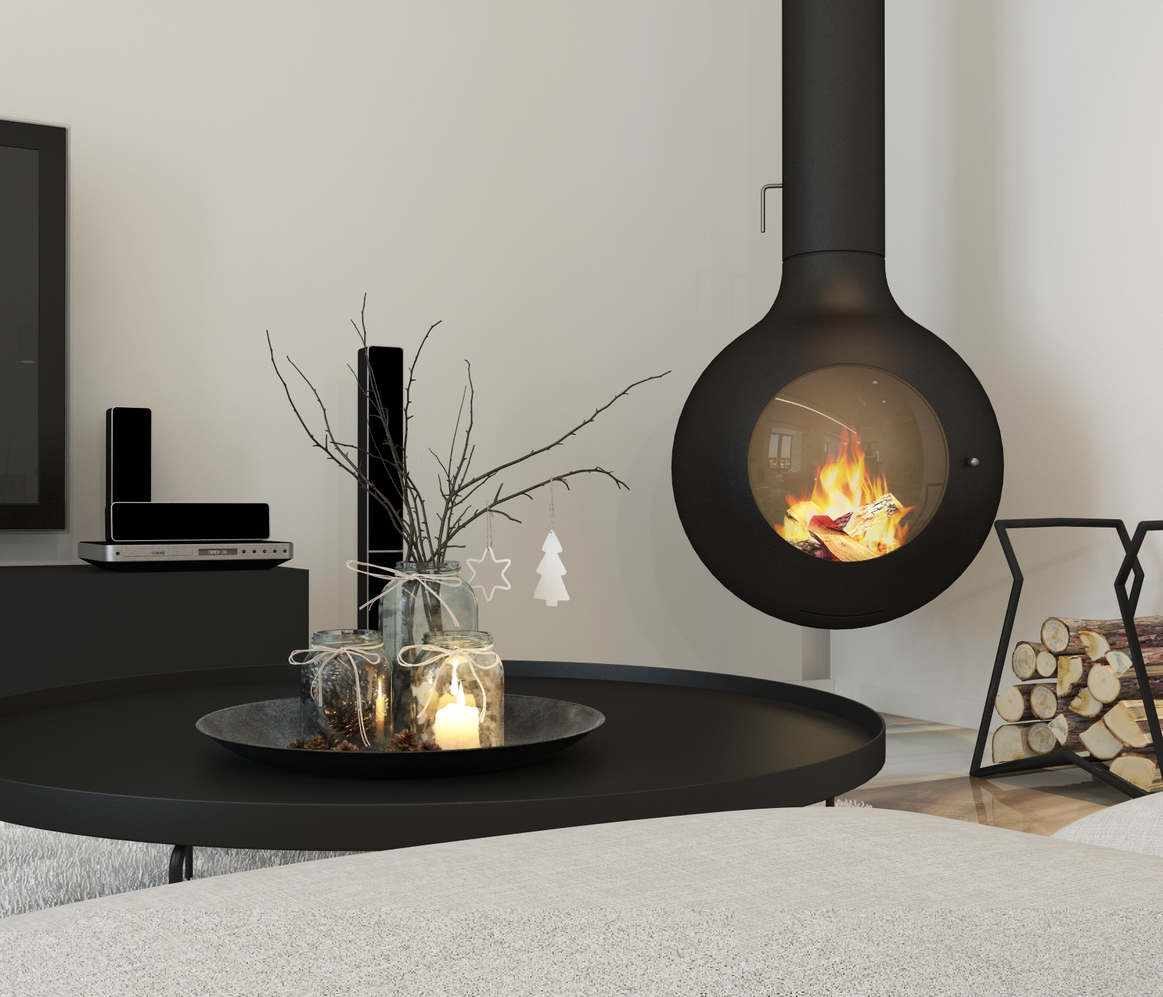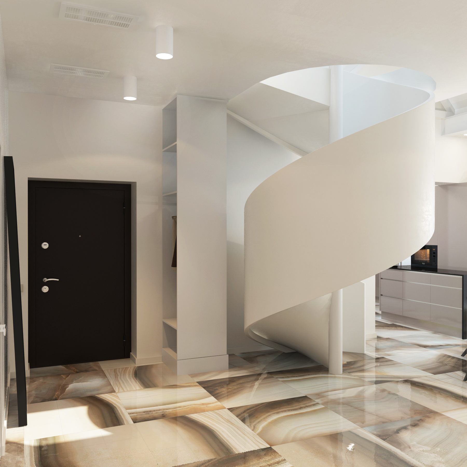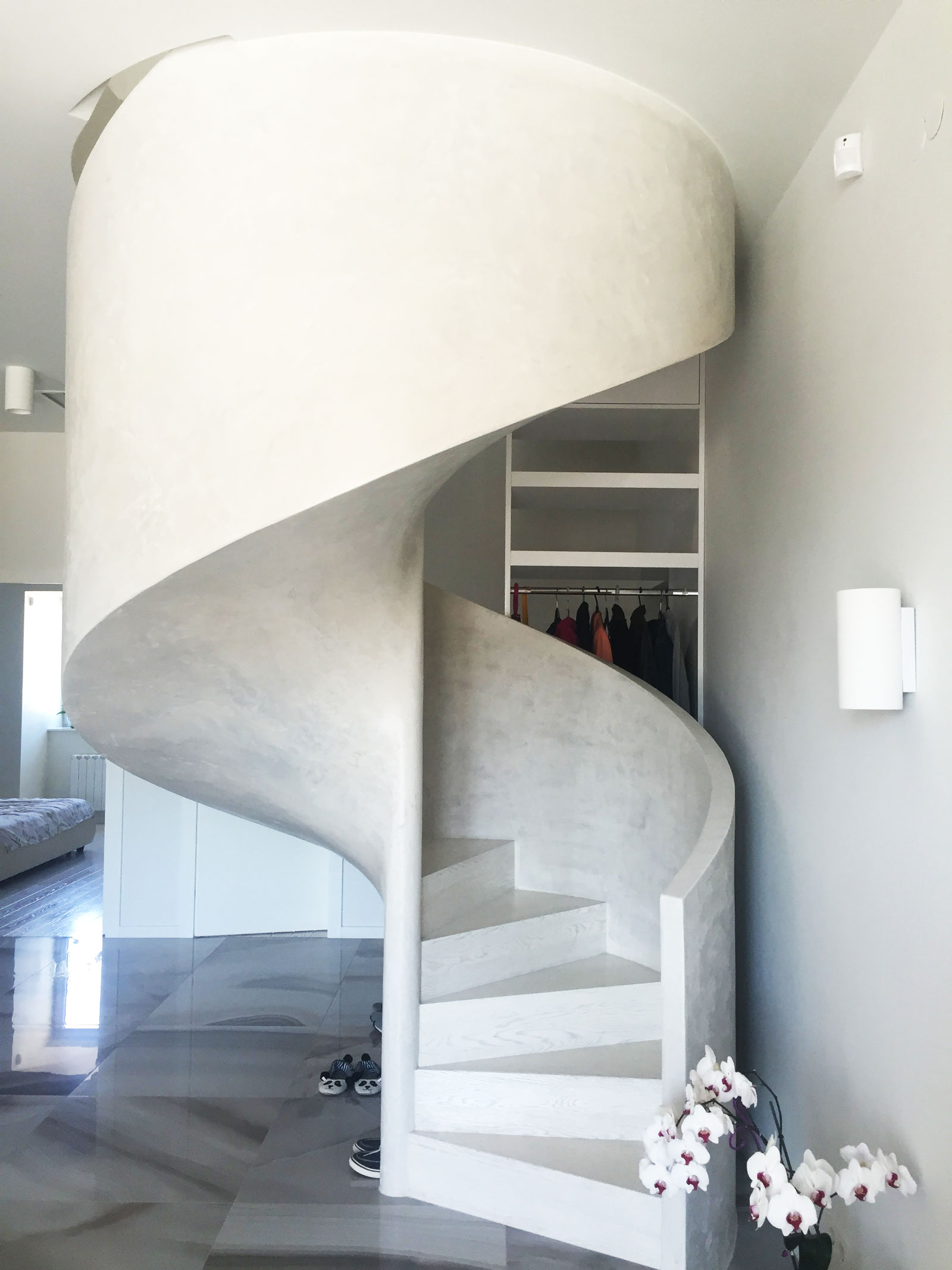 First option of the penthouse design project. Living room with full concrete stairs, fireplace and copper wall.