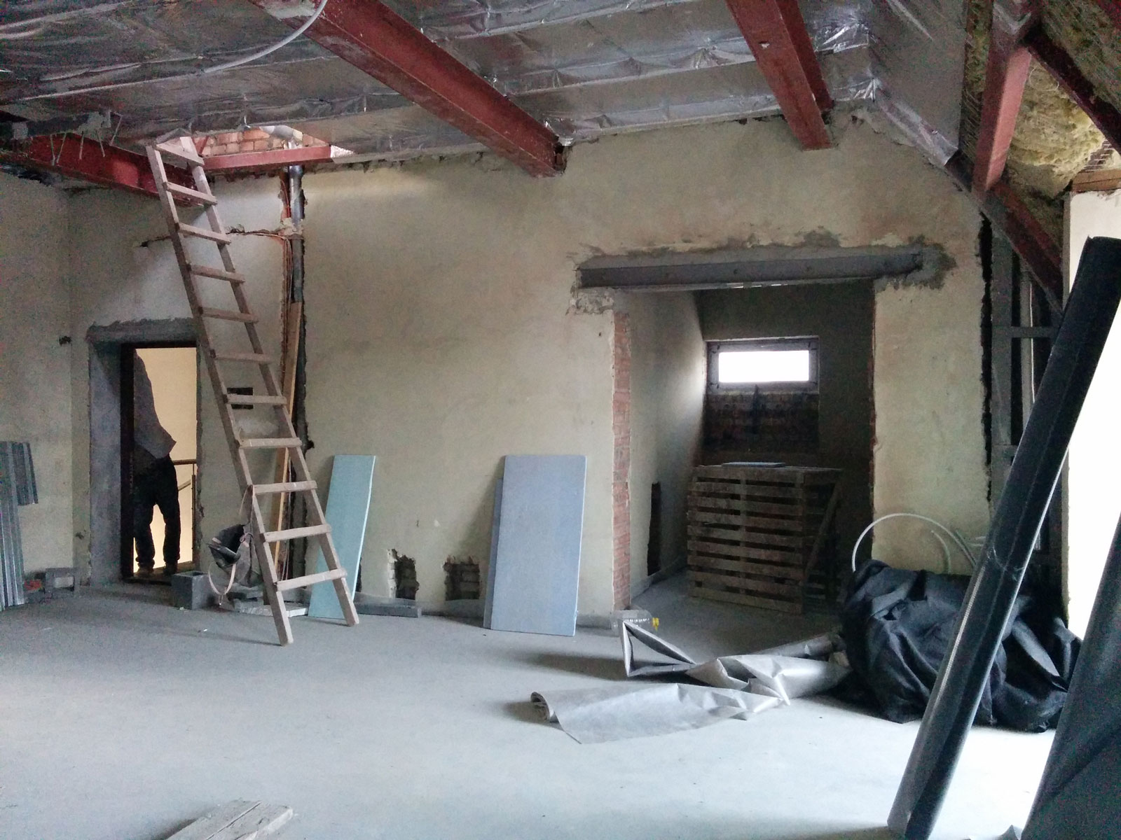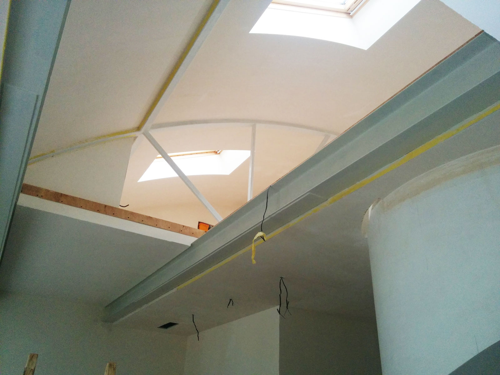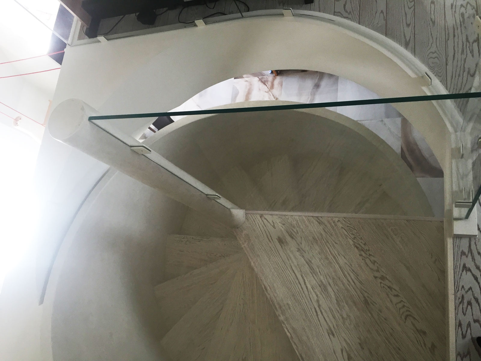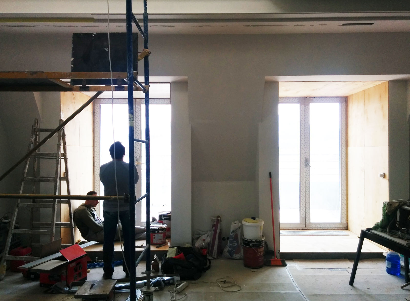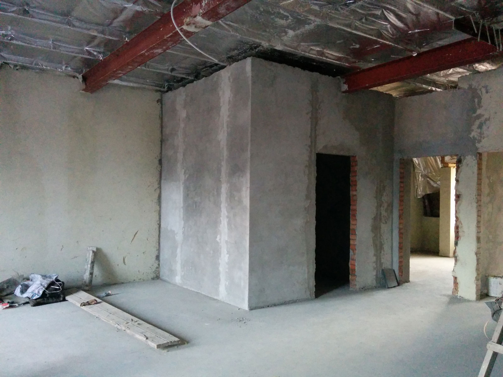 First option of the penthouse design project. Living room with full concrete stairs, fireplace and copper wall.
