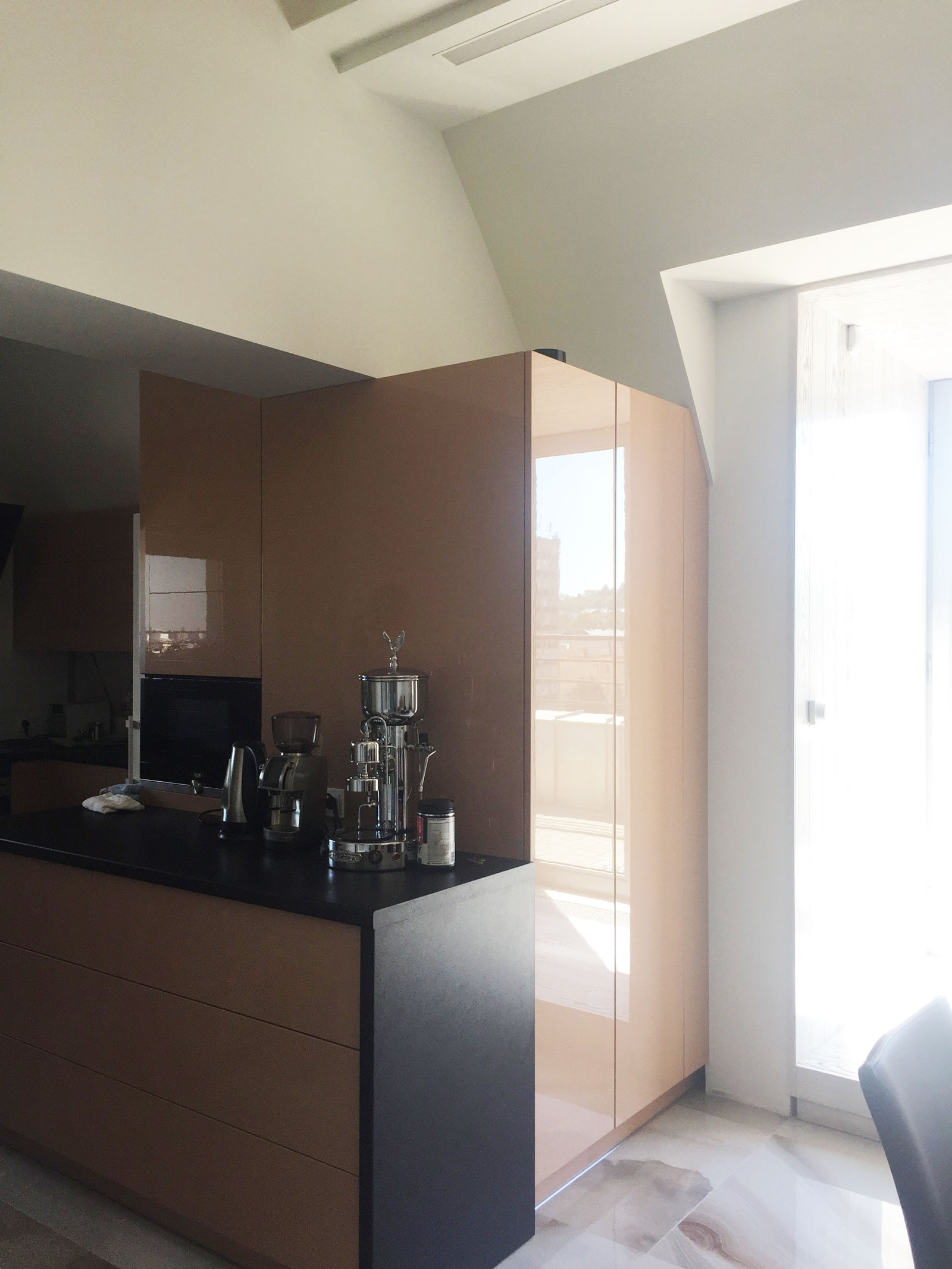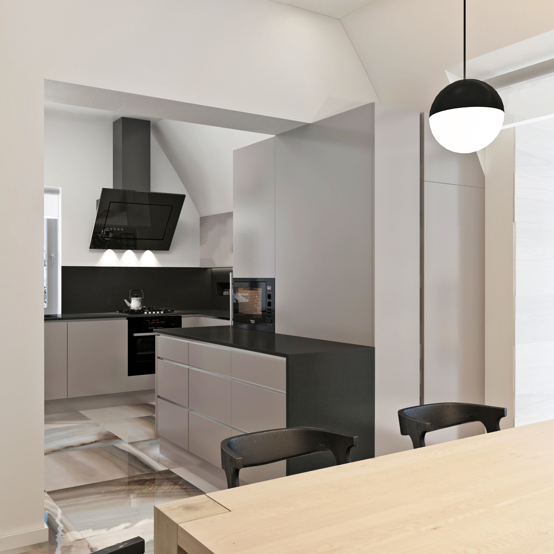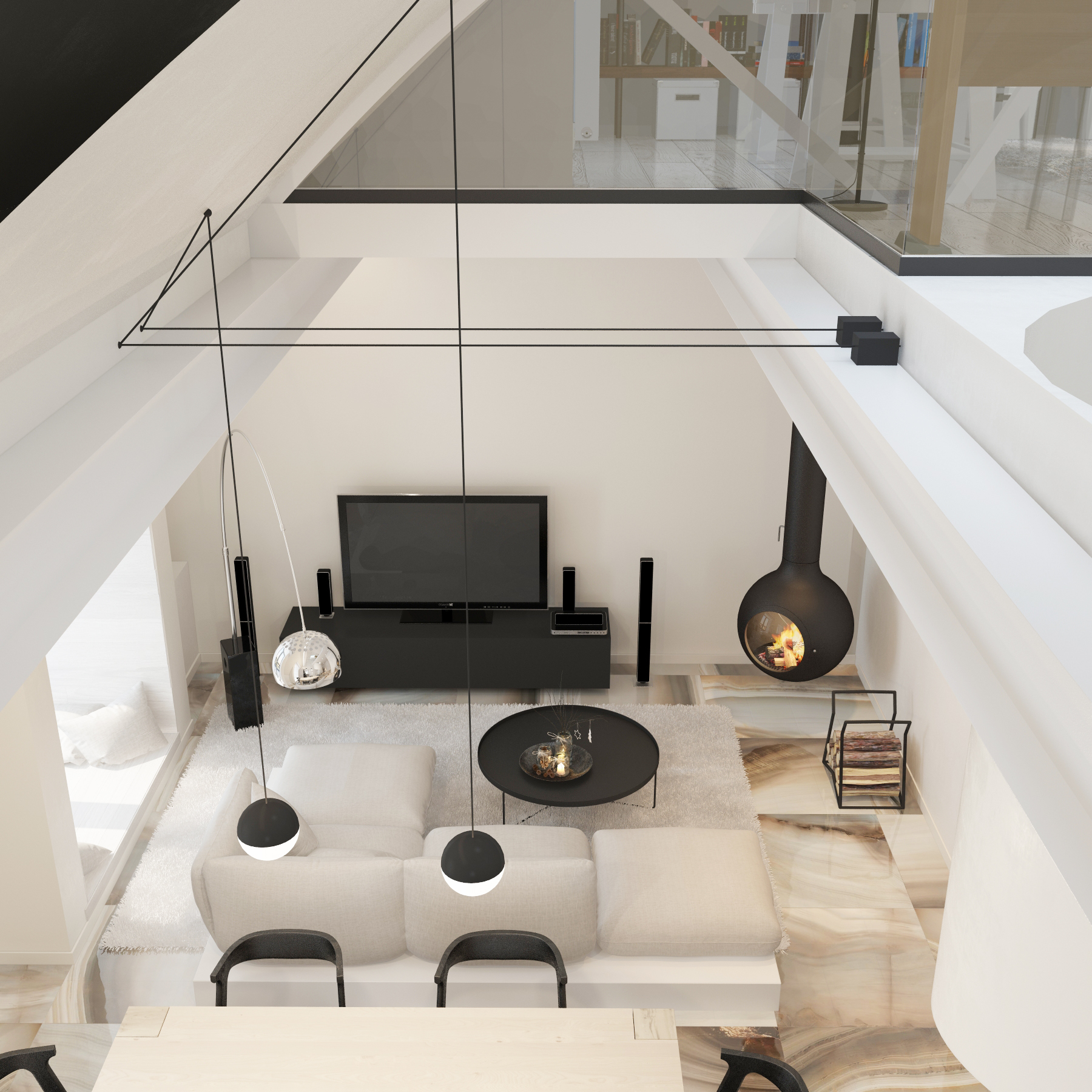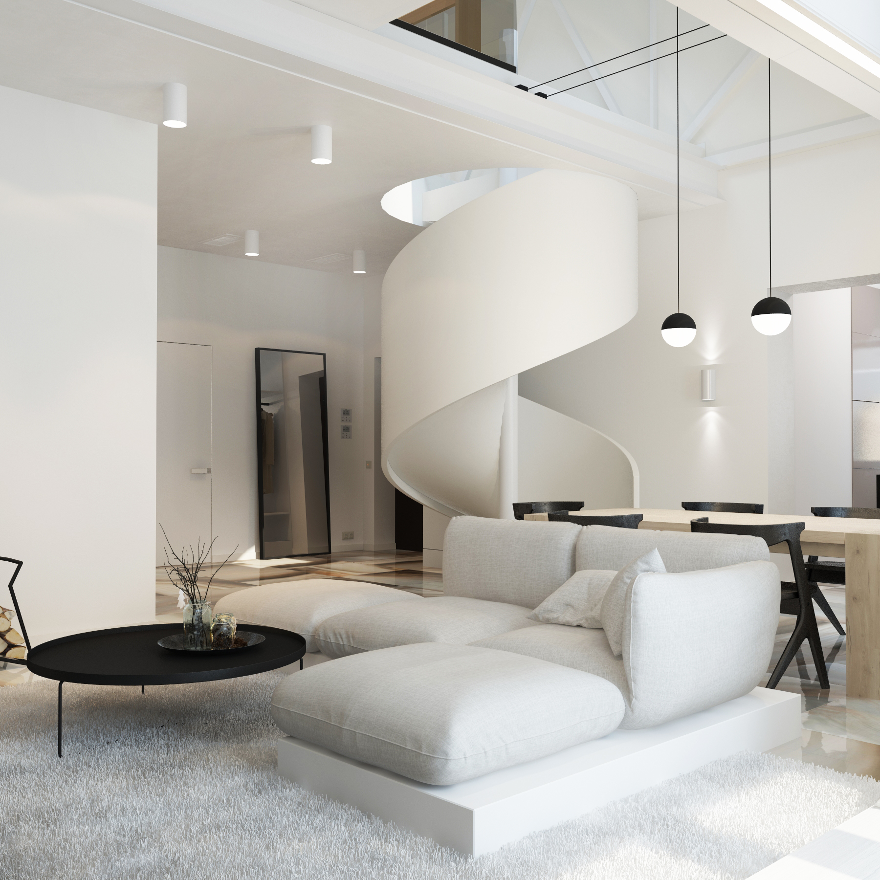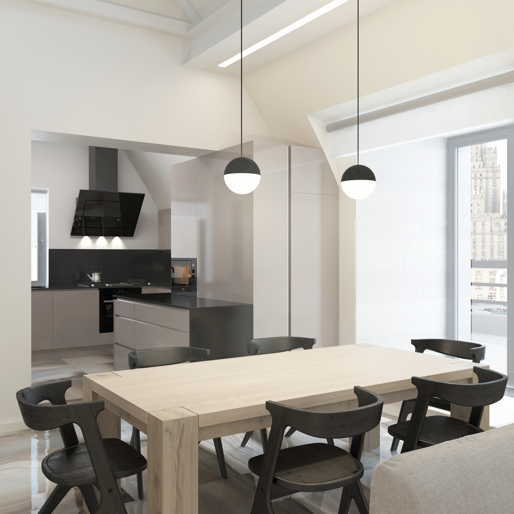 Living room for a young family, part of the penthouse design project. Living and dining room is a one open space connected with a small kitchen.