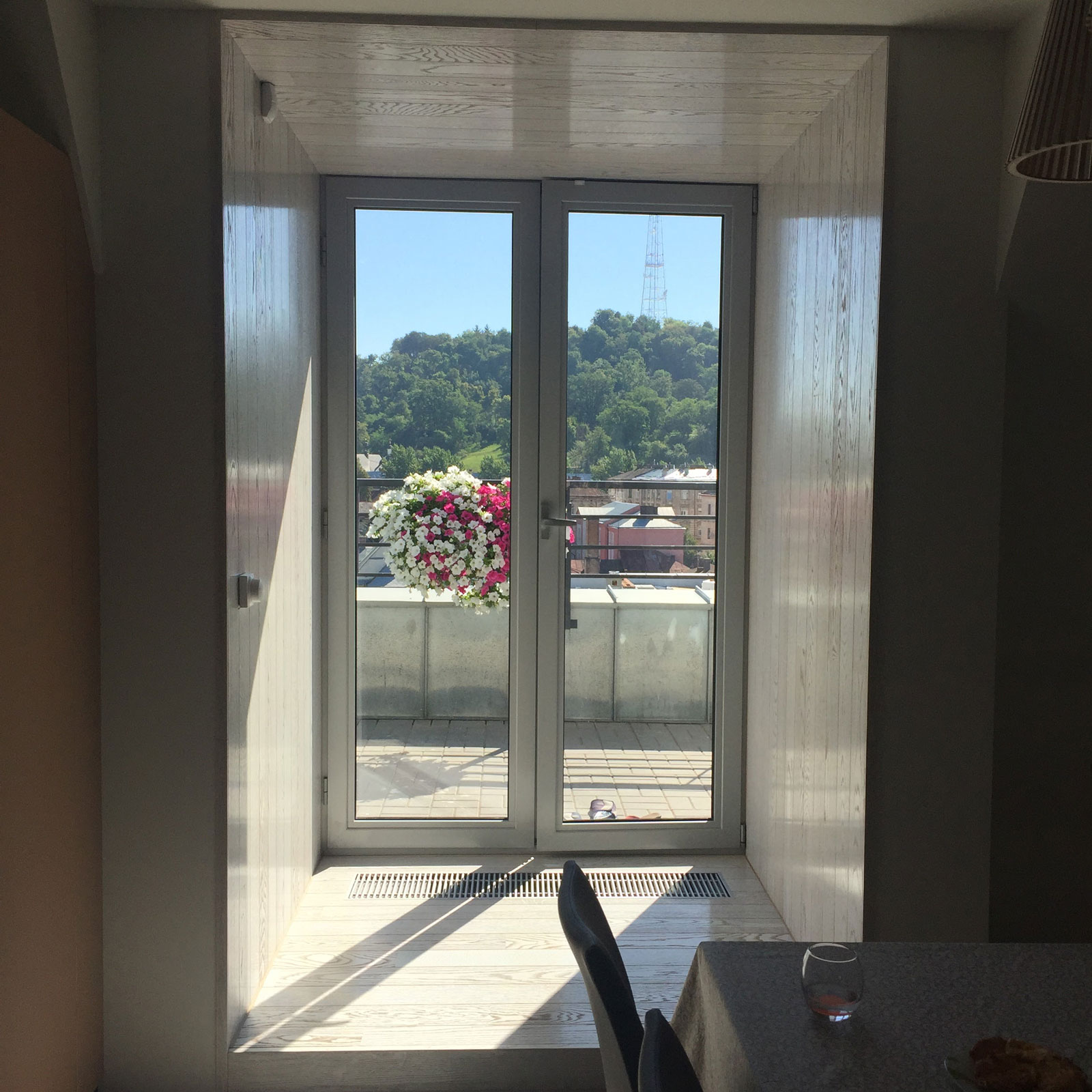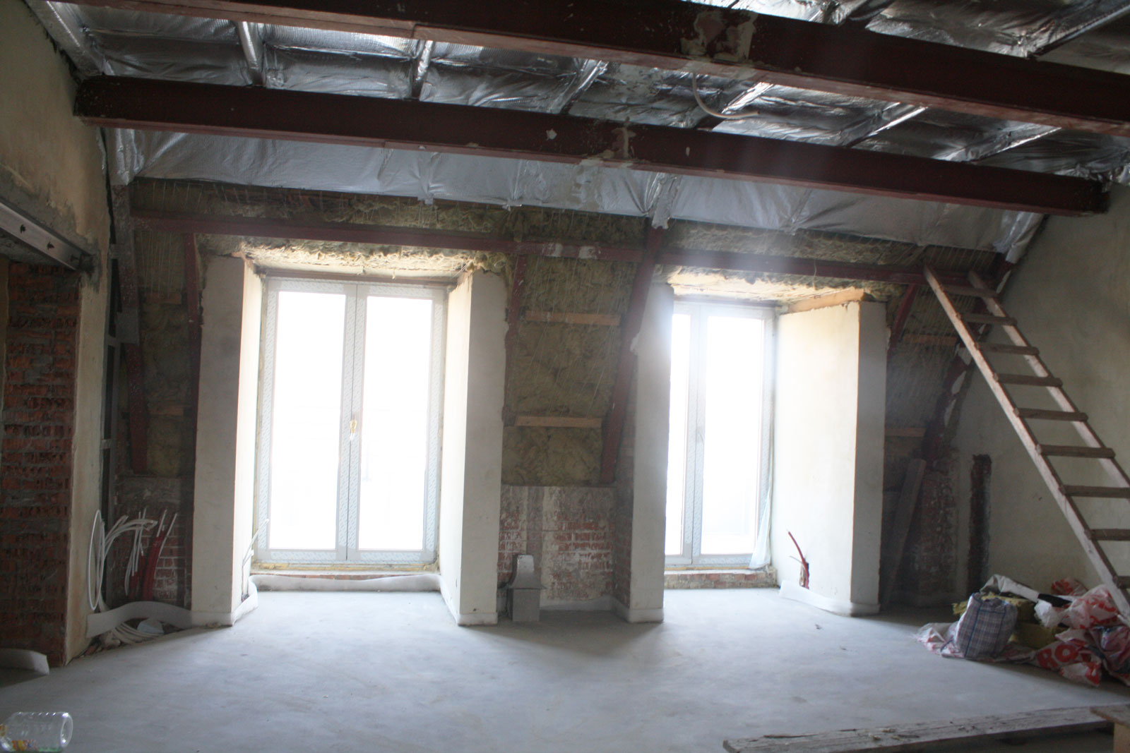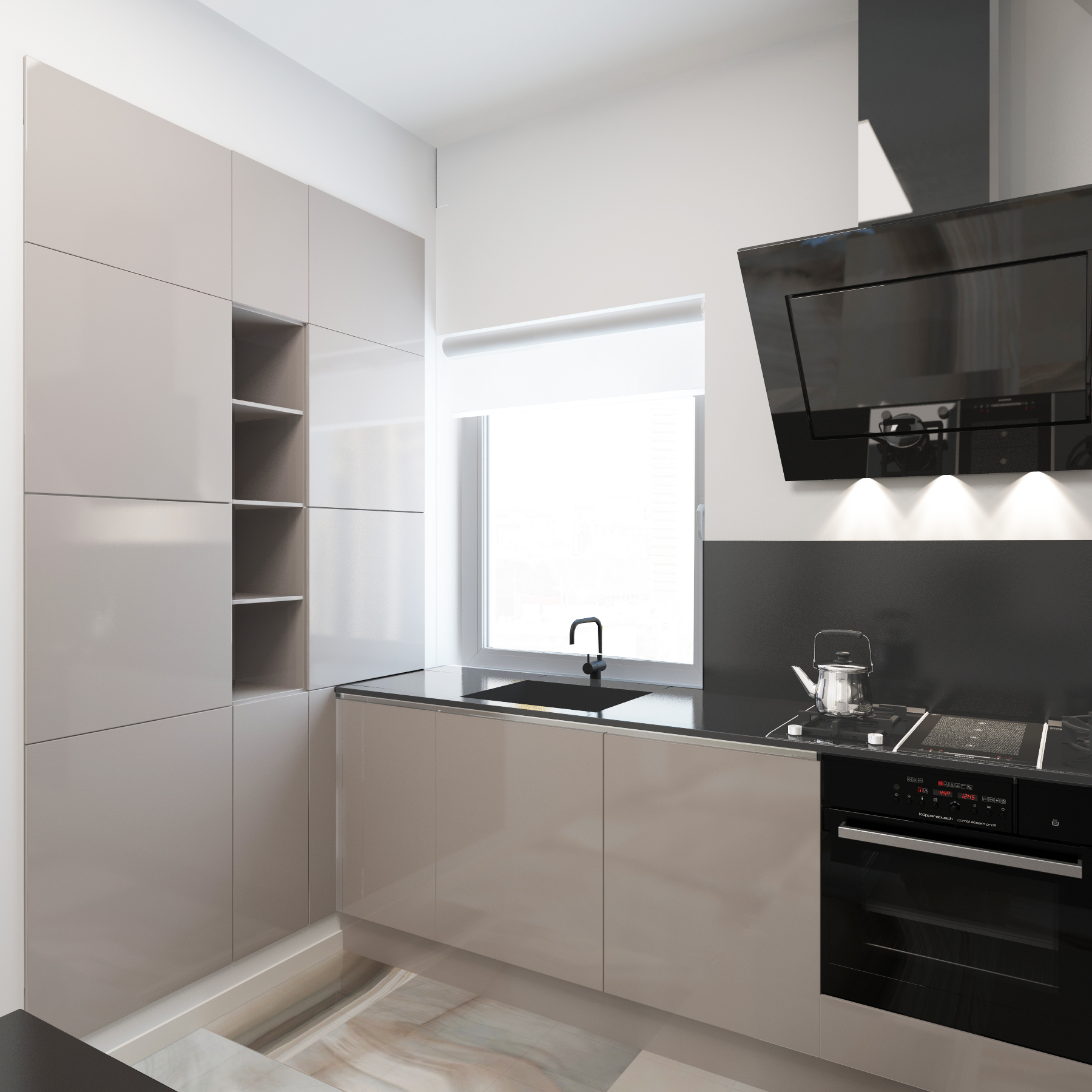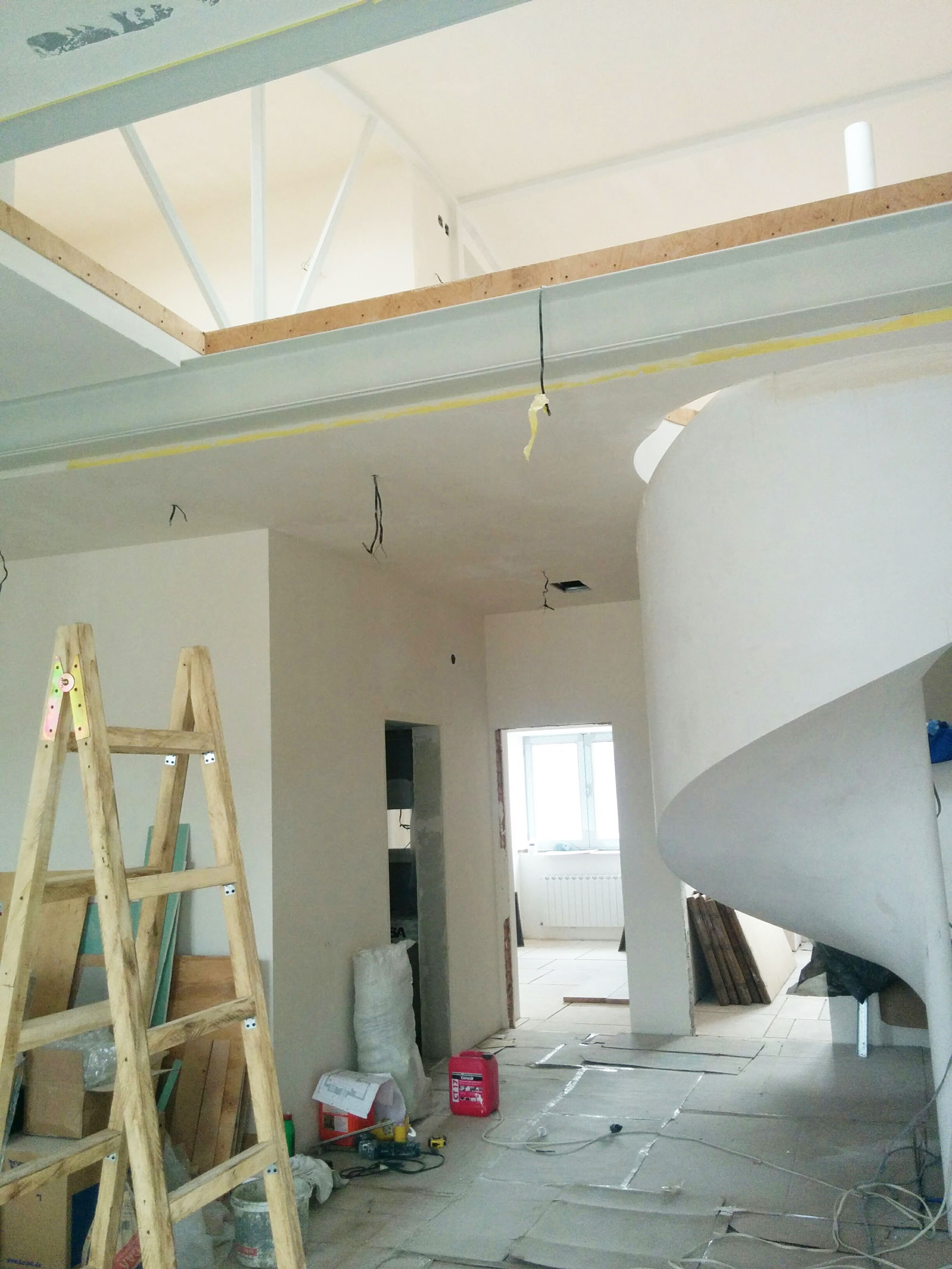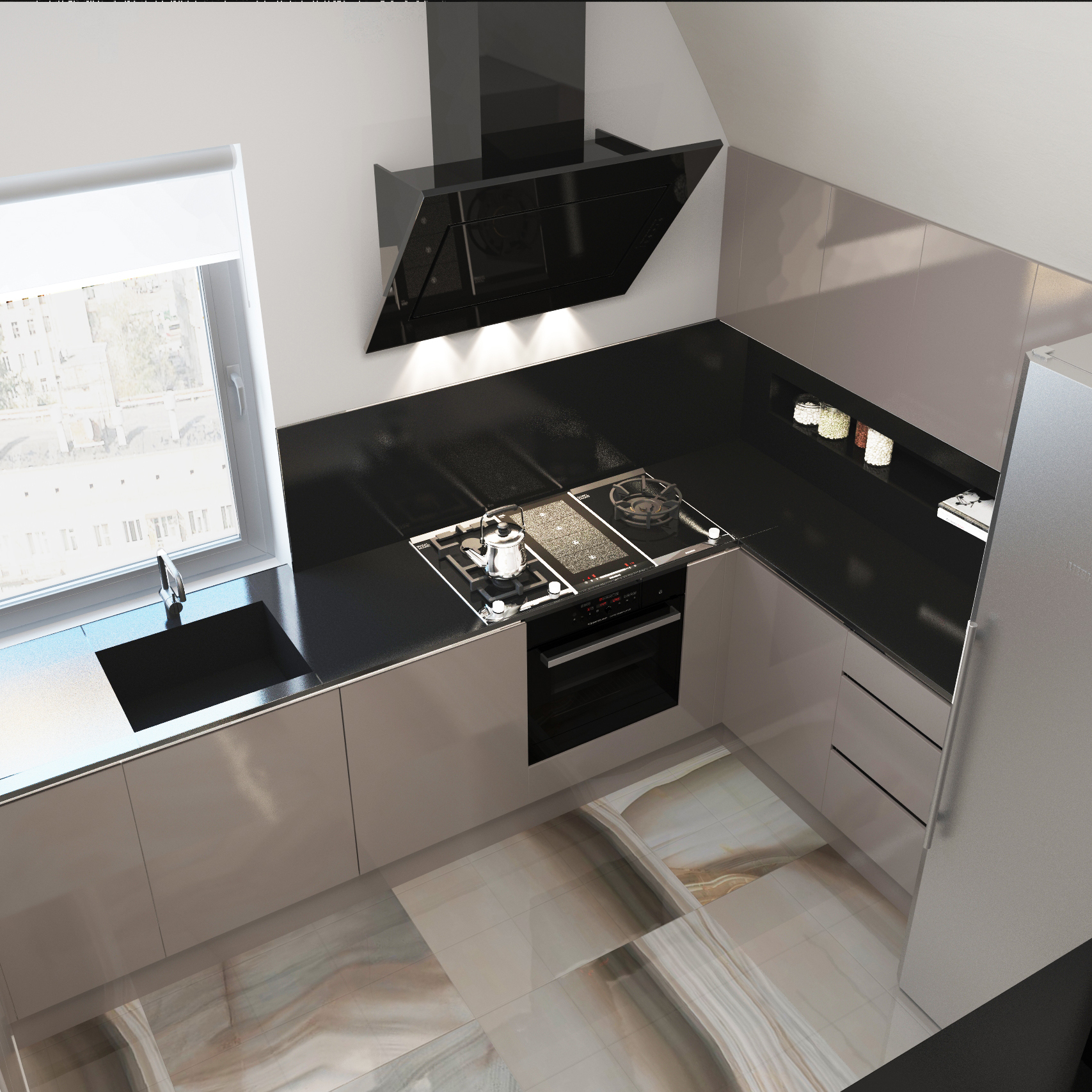 Living room for a young family, part of the penthouse design project. Living and dining room is a one open space connected with a small kitchen.