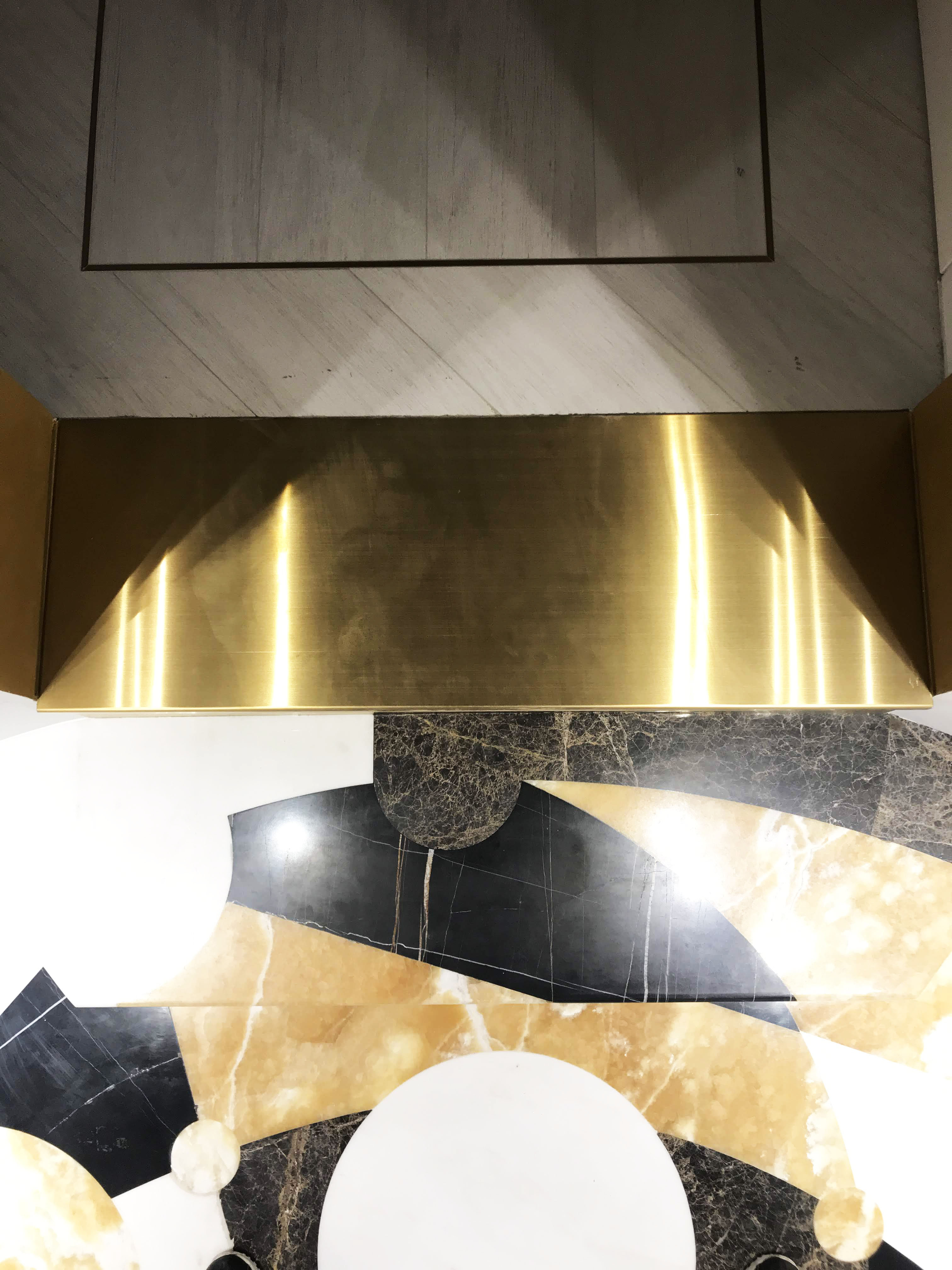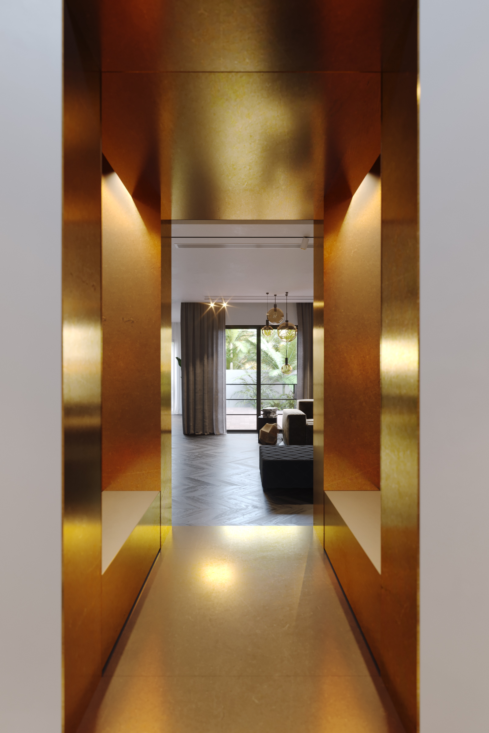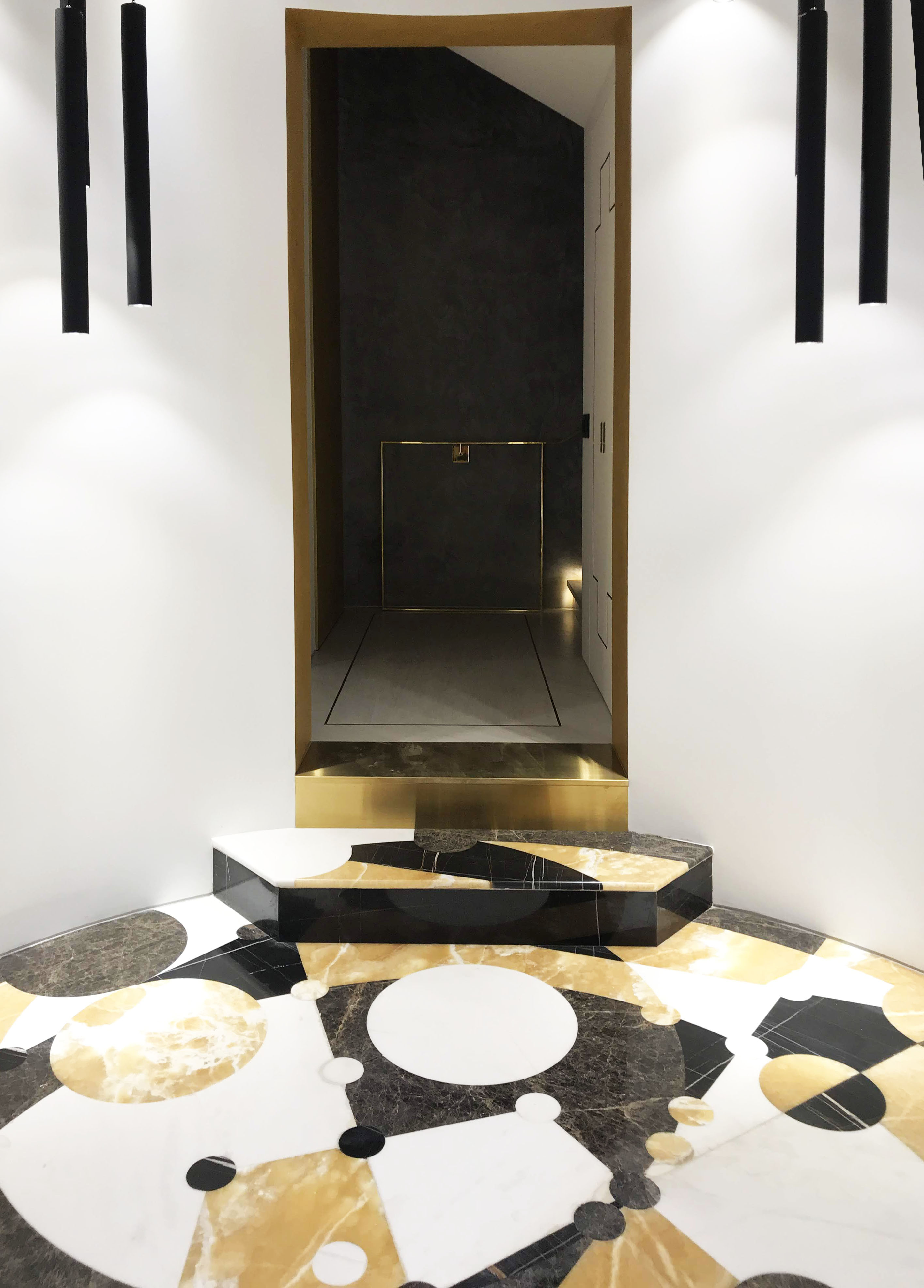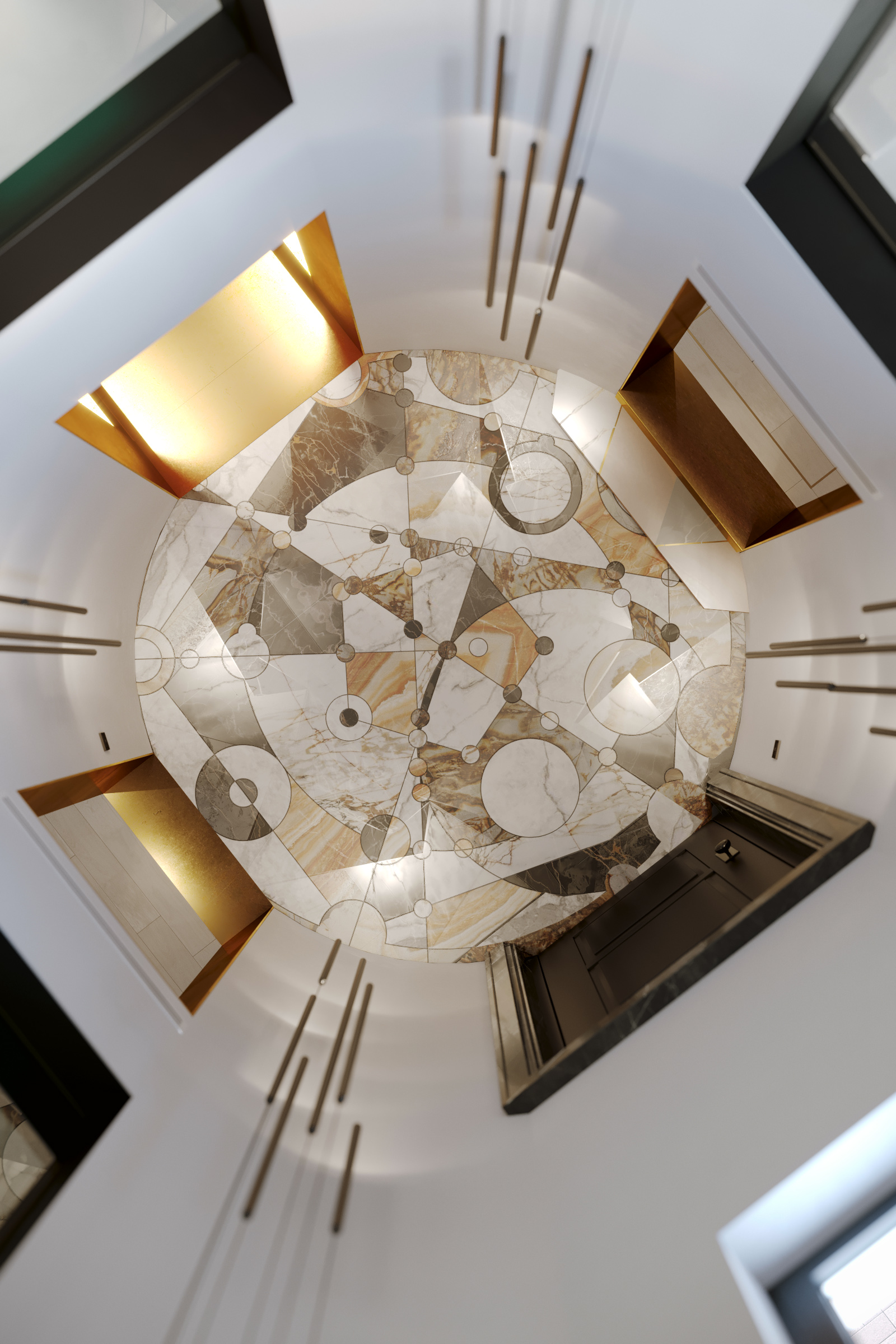 The main entrance to the Villa is round shape, two floors high. On a floor is a panno of marble and onyx combinations. The picture reflects alchemy formula of creation gold. Three doorways covered in yellow metal. The main door decorated with a black marble frame.
