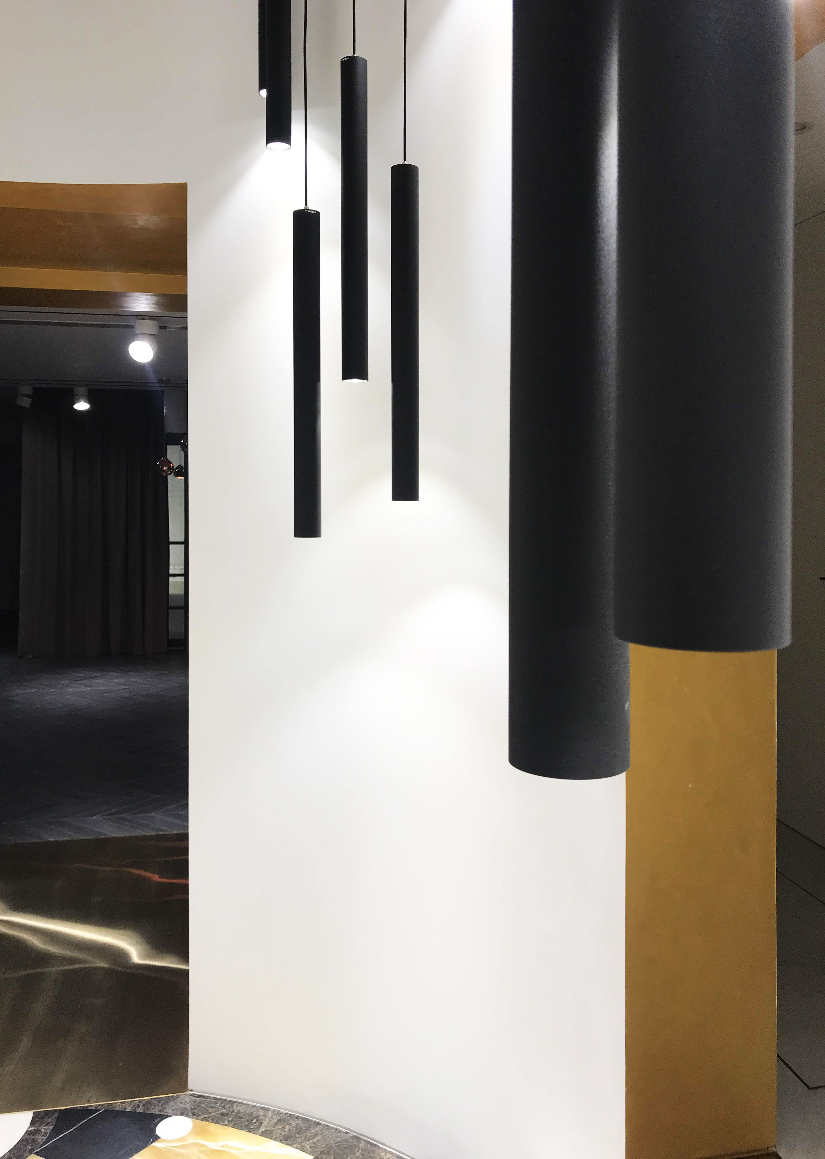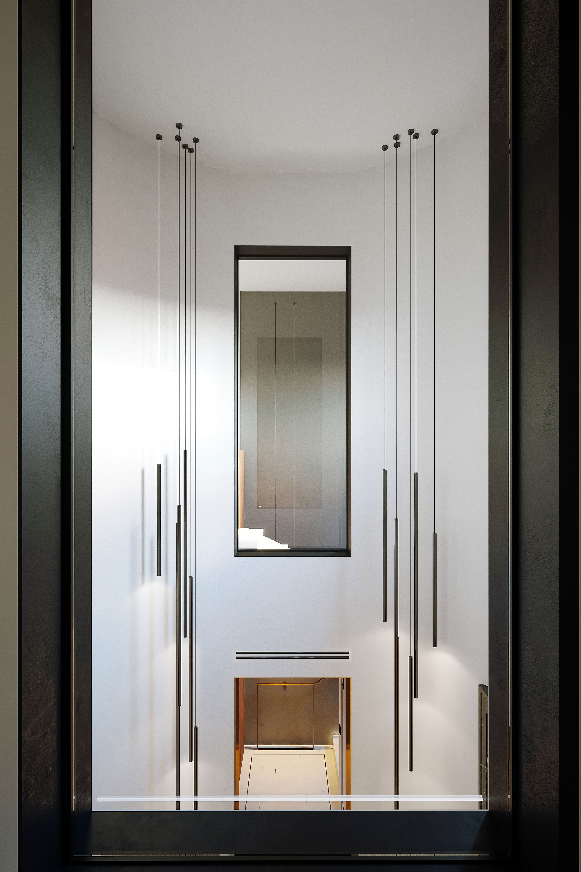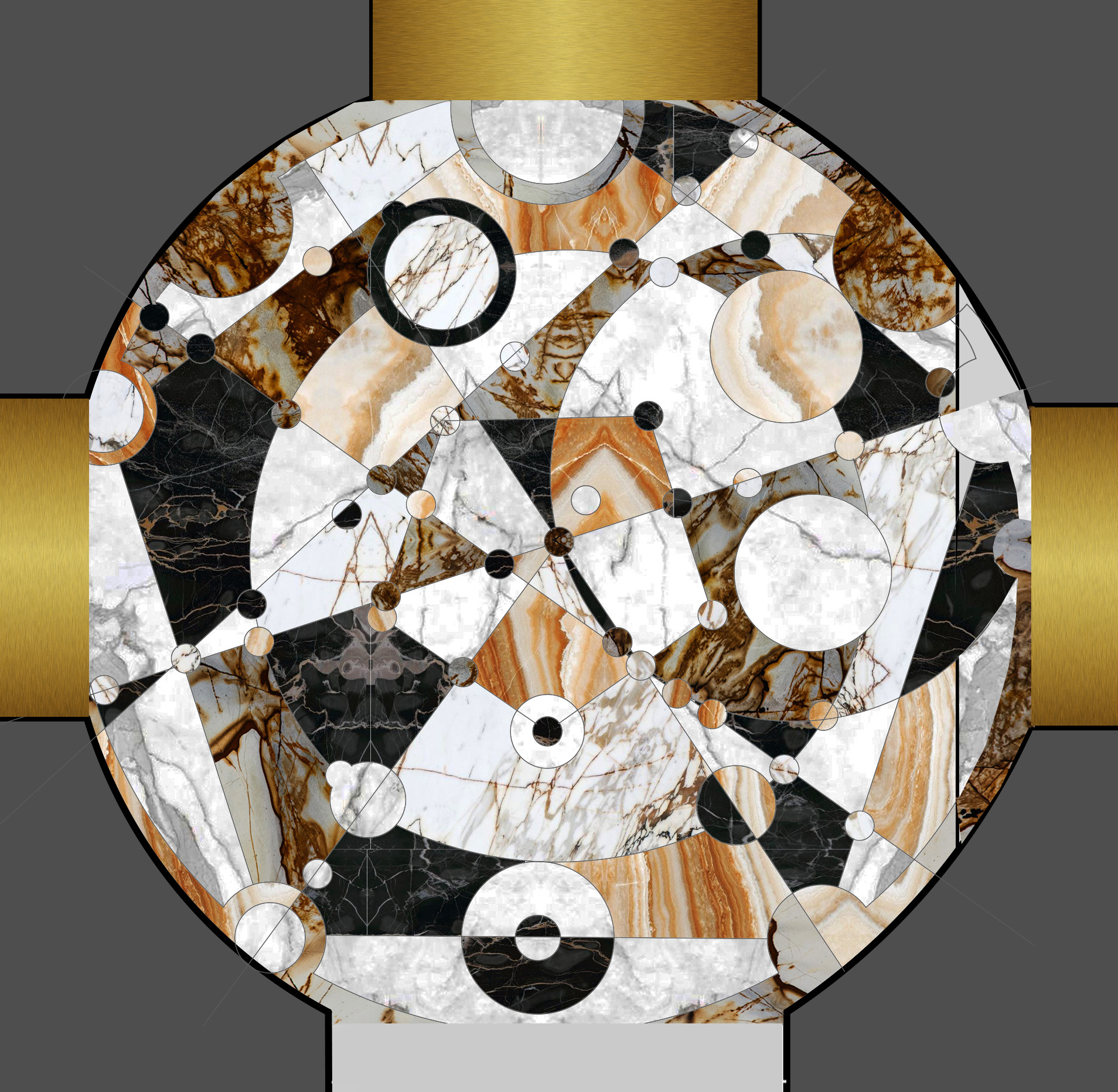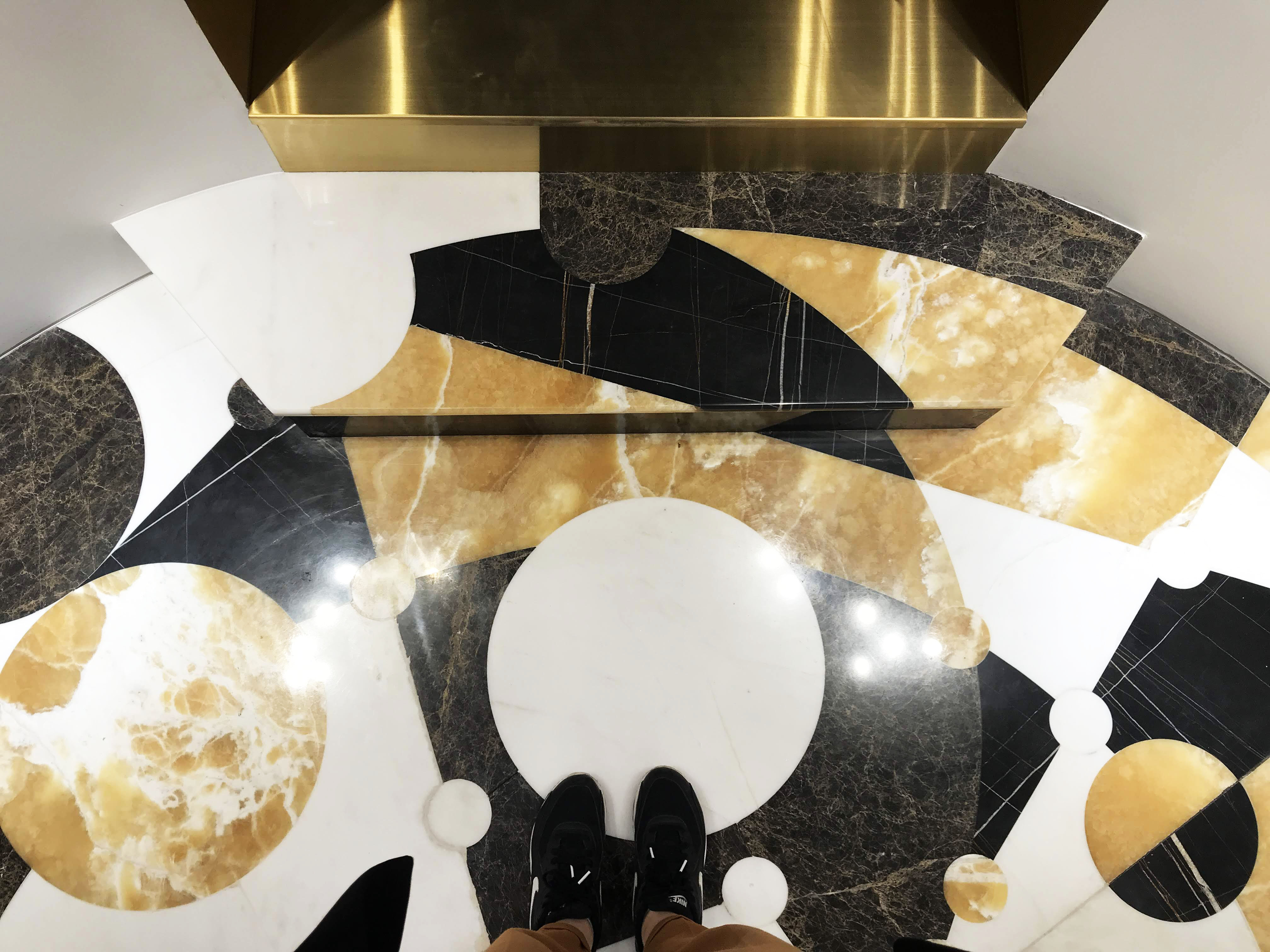 The main entrance to the Villa is round shape, two floors high. On a floor is a panno of marble and onyx combinations. The picture reflects alchemy formula of creation gold. Three doorways covered in yellow metal. The main door decorated with a black marble frame.